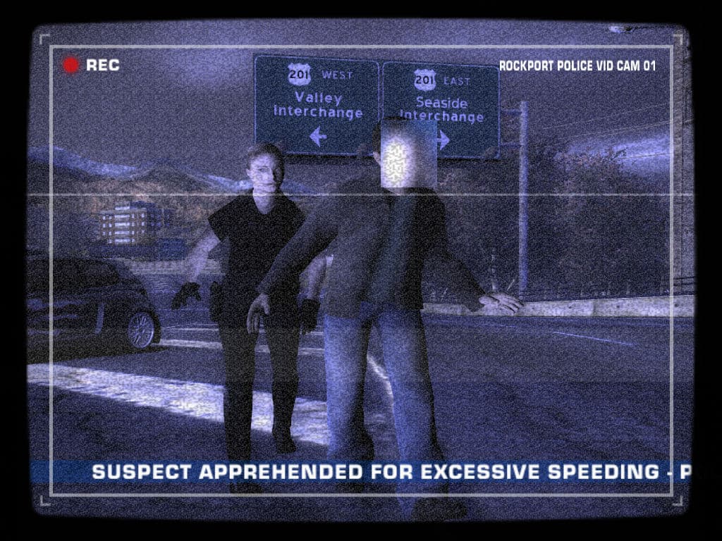 Рассмотрим еще две картинки, на первой из которых — пример комплексной дополнительной обработки кадра, когда используется несколько фильтров одновременно: saturation, glare, bloom, motion blur, distortion, а на второй — постфильтр noise, имитирующий телевизионное изображение во время сцен ареста игрока полицией.