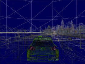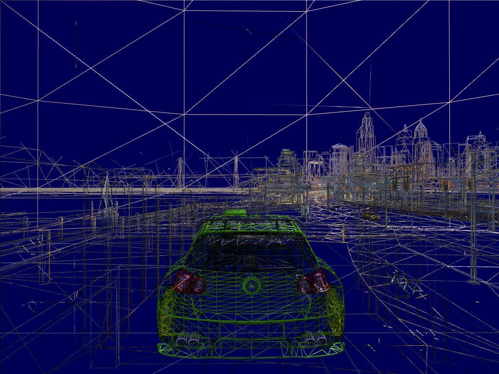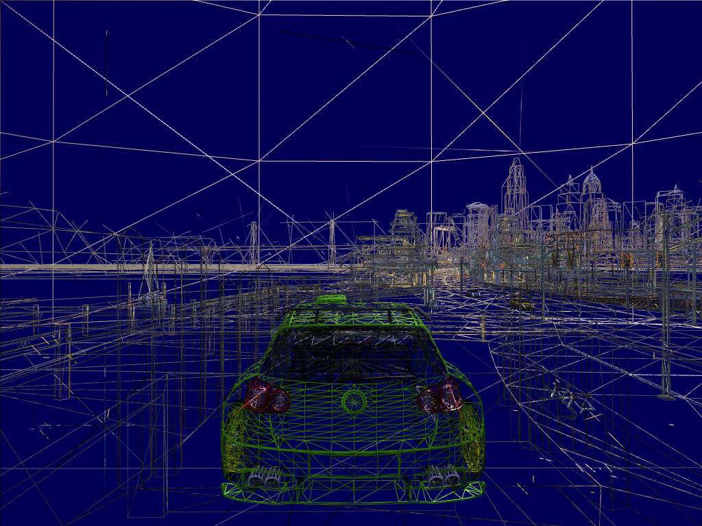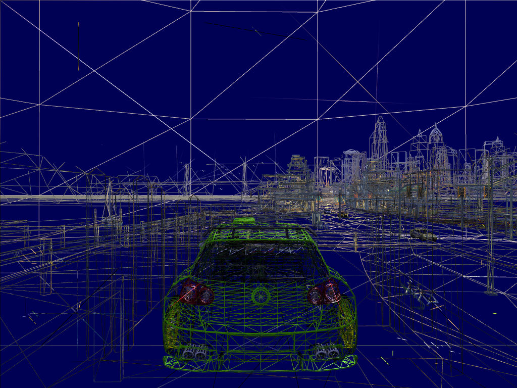 Car Geometry Detail (Low/High) — настройка, служащая для изменения количества полигонов в моделях автомобилей. Судя по настройке, должно существовать два набора моделей (уровней детализации), при установке в нижнее значение должны использоваться менее качественные модели, которые нужны для баланса между производительностью и качеством, все равно в игре на больших скоростях модели рассматривать не удается. А при значении «High», модели автомобилей должны быть максимально детализированы. Я не нашел никакой разницы в моделях автомобилей при разных значениях настройки, в качестве доказательства прикладываю скриншоты в режиме wireframe. Соответственно, влияния настройки Car Geometry Detail на скорость рендеринга также обнаружено не было.