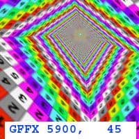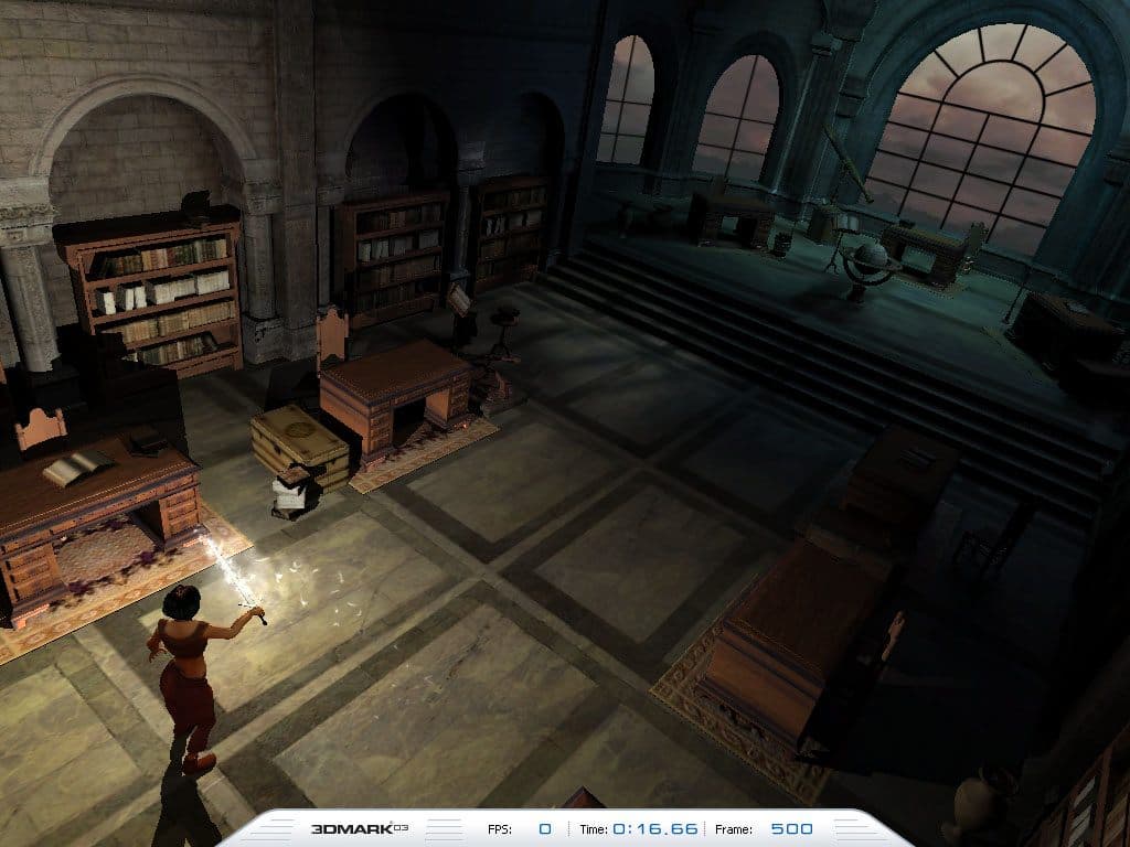 - DirectX 7.0 тест; примерно 32000 полигонов в сцене, под текстуры используется 16 мегабайт видеопамяти, 6 мегабайт для буферов под вершины и 1 мегабайт для индексов.