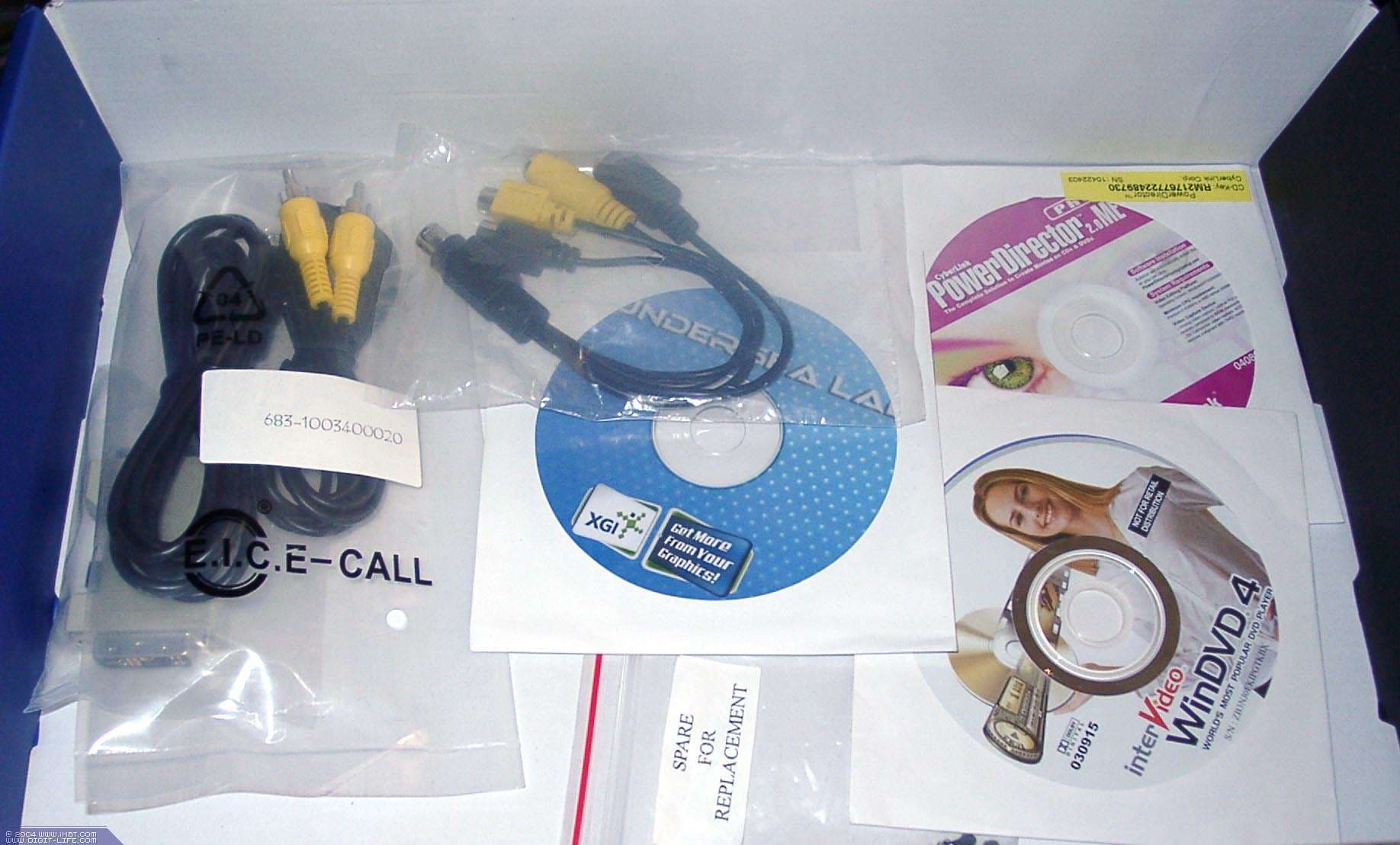 | Внутри коробки можно найти руководство пользователя, диски с ПО и PowerDVD, а также ПО для VIVO. Плюс переходник-разветвитель VIVO, DVI-to-d-Sub, удлинители TV и фирменную наклейку на корпус. | ![]() |