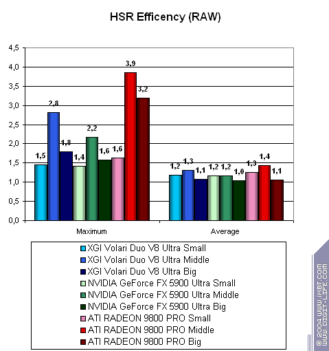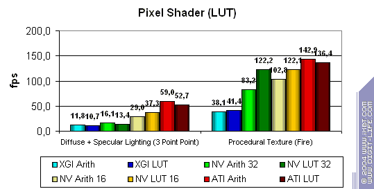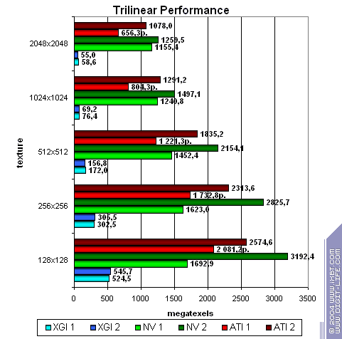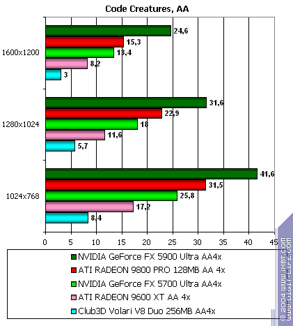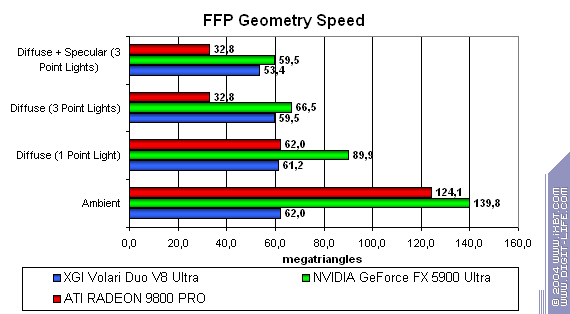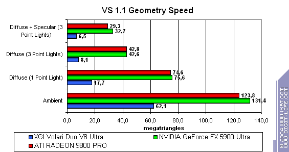 Очевидно, что продукт от XGI проиграл просто по-страшному! Заметим, что часто эта карта отстает даже от середняков, таких как FX 5700 Ultra и RADEON 9600 XT. Особенно снова видно поражение при работе с шейдерами.