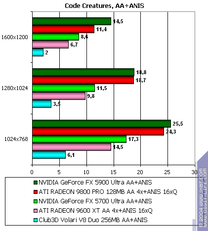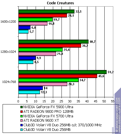 - Code Creatures Benchmark Pro (CodeCult) — игровой тест, демонстрирующий работу платы в DirectX 8.1, Shaders, HW T&L.
