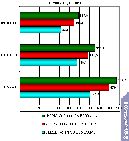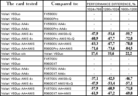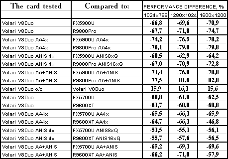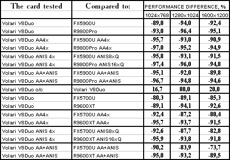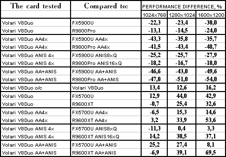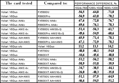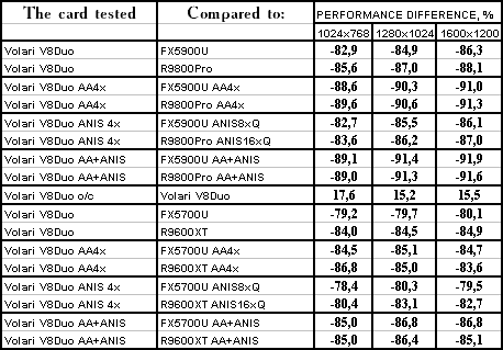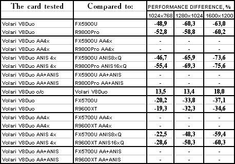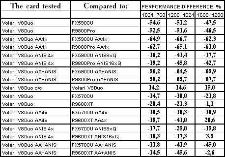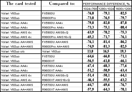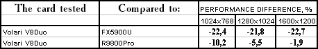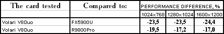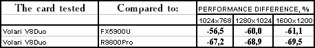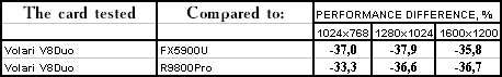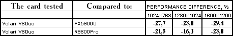 | GeForce FX 5900 Ultra | RADEON 9800 PRO | Volari Duo V8 Ultra | |