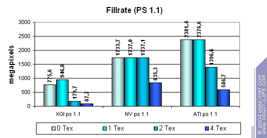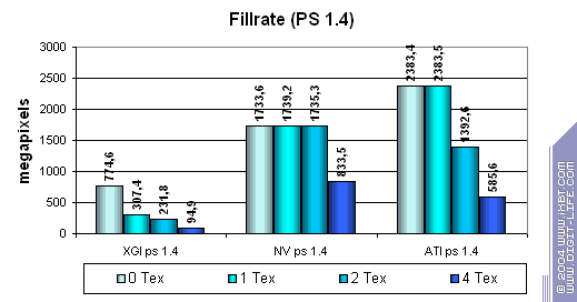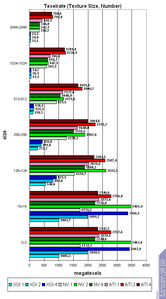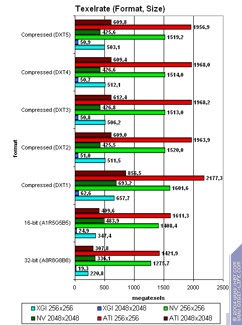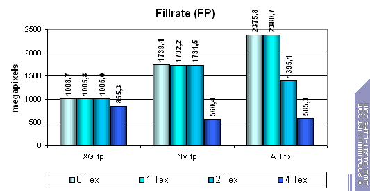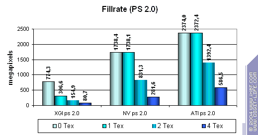 В принципе данные согласуются с тем что мы получили ранее в тесте D3D RightMark, хотя и есть небольшие различия — результаты Volari в случае одной текстуры чуть лучше (но по прежнему в несколько раз ниже его теоретических пределов), а вот из ATI и NVIDIA тест выжимает меньшие значения. Сказывается отличия к подходу построения этих синтетических тестов — но, разумеется, мы склоняемся больше доверять нашему собственному методу измерения скорости закраски, исходные тексты которого доступны для всех желающих на сайте D3D RightMark.