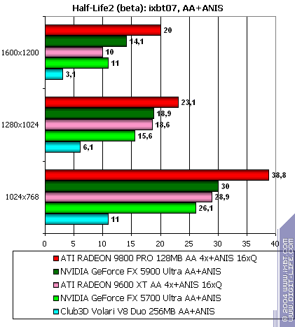 - Half-Life2 (Valve/Sierra) — DirectX 9.0, две разных записанных demo (ixbt07 и coast). Тестирование проводилось при включенной анизотропной фильтрации, а также в тяжелом режиме с АА и анизотропией.
