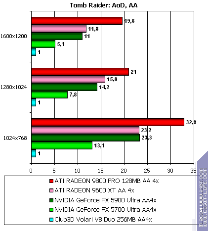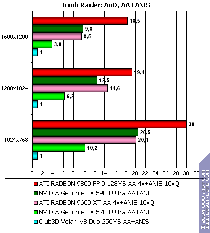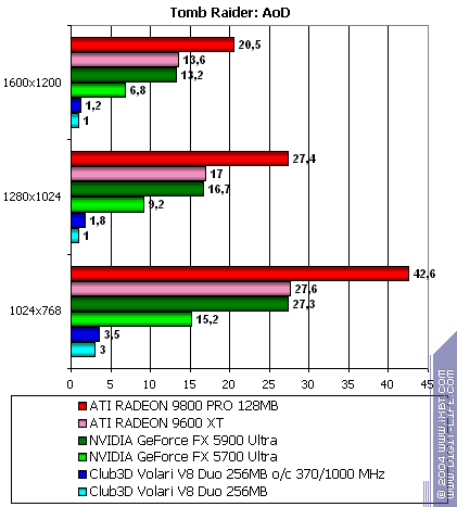 - Tomb Raider: Angel of Darkness v.49 (Core Design/Eldos Software) — DirectX 9.0, три разных записанных demo. Тестирование проводилось при максимально установленном качестве, выключены были лишь Depth of Fields PS20. настройки тестирования приведены здесь.