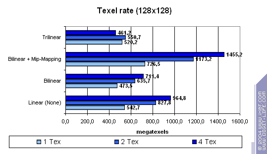 - DirectX 8.1 тест; примерно 560 000 полигонов в сцене при использовании пиксельных шейдеров 1.1 (и 280 000 полигонов — если используются шейдеры 1.4), под текстуры используется 64 мегабайт видеопамяти, 19 мегабайт для буферов под вершины и 2 мегабайта для индексов.