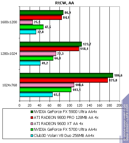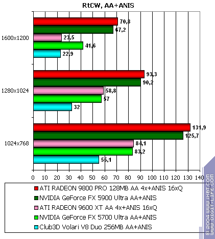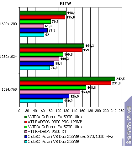 - Return to Castle Wolfenstein (MultiPlayer) (id Software/Activision) — OpenGL, мультитекстурирование, Checkpoint-demo, настройки тестирования — все на максимально возможном уровне, S3TC OFF, конфигурации можно скачать тут