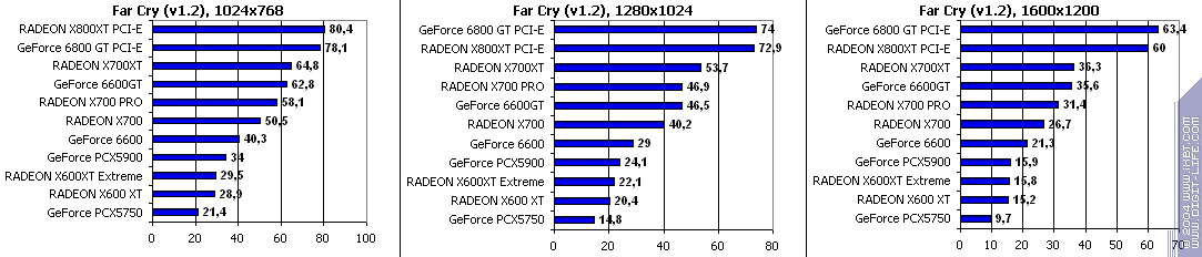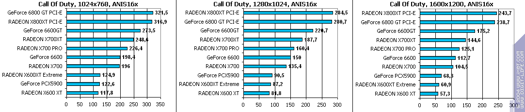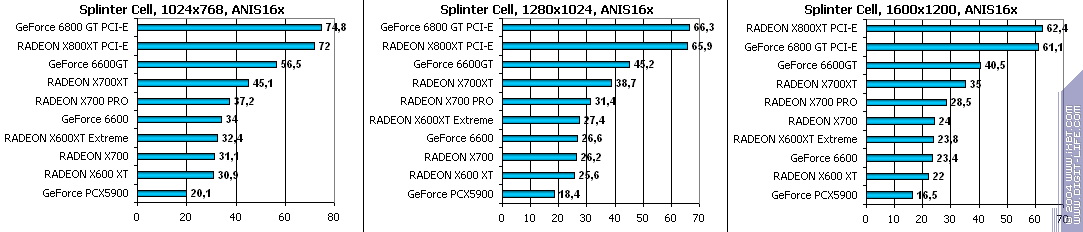 - RADEON X700 PRO — против GeForce 6600GT — хоть в 1600х1200 при АА и АА+АФ продукт Sapphire и выиграл, но никто на таких картах не будет использовать ни подобное разрешение, ни включать АА+АФ, ибо играбельность без них-то не особо высока даже в 1024х768.