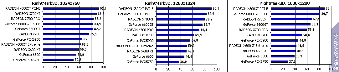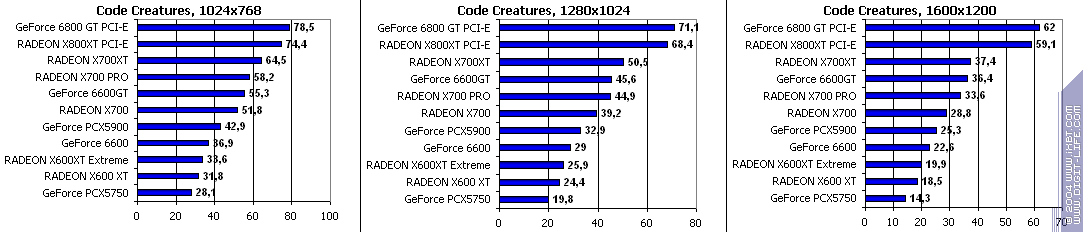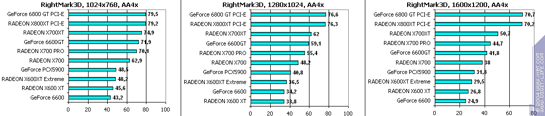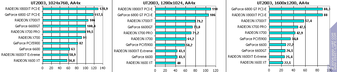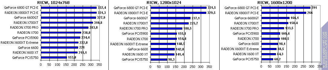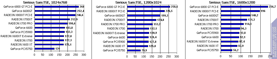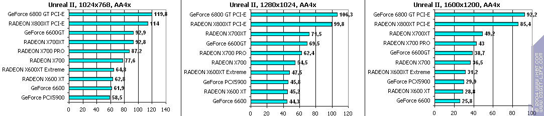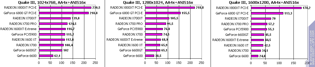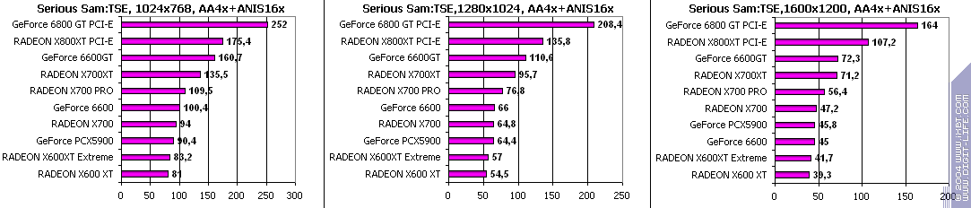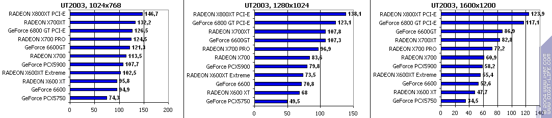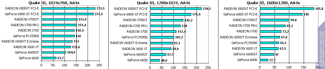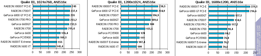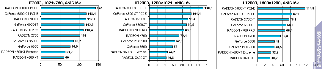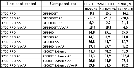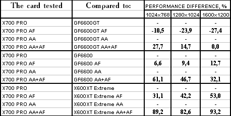 Все аналогично! 6600GT лучше всех, затем идет X700 PRO, а потом уже GeForce 6600. Где находится X600XT, говорить не станем, неприлично.