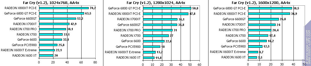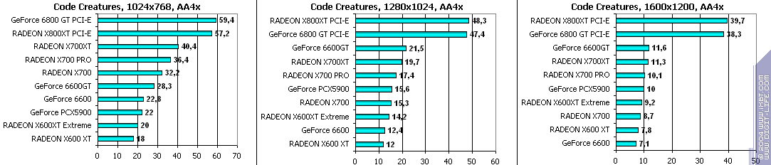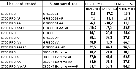 - RADEON X700 PRO — против GeForce 6600GT — только в 1600х1200 при АА или АА+АФ удалось сильно выиграть! А остальных случаях поражение, хотя уже и довольно пустяковое. Все же АА — это ахиллесова пята у 6600GT.