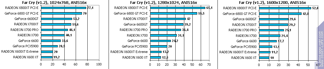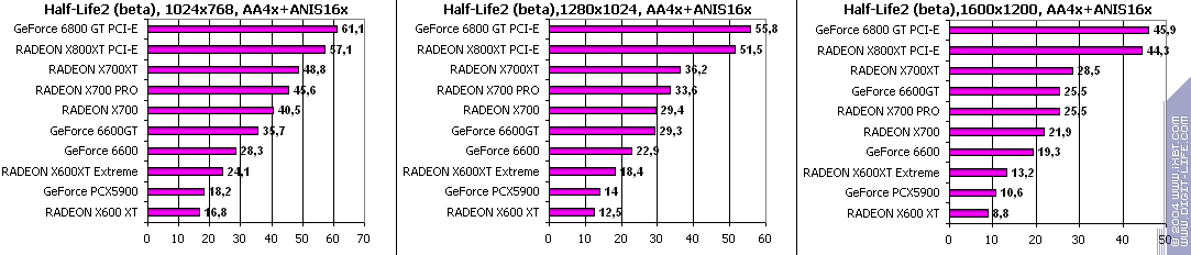 - Half-Life2 (Valve/Sierra) — DirectX 9.0, demo (ixbt07. Тестирование проводилось при включенной анизотропной фильтрации, а также в тяжелом режиме с АА и анизотропией.