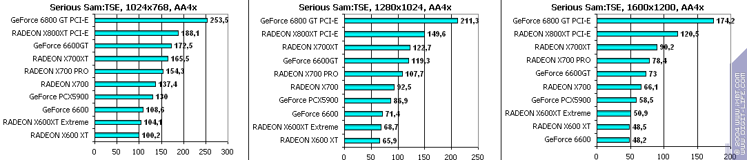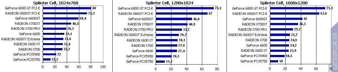 Расклад сил такой же: GeForce 6600GT; X700 PRO; GeForce 6600; X600 XT Extreme. Причем отставание второго от первого очень велико.