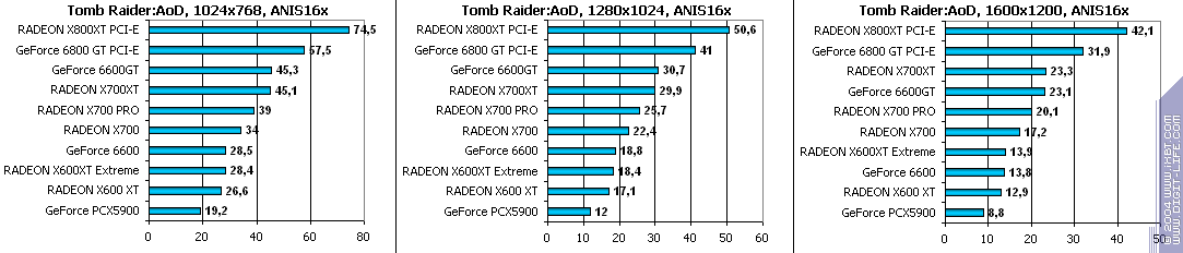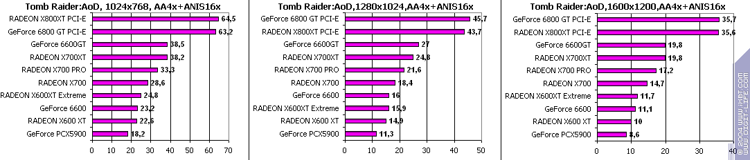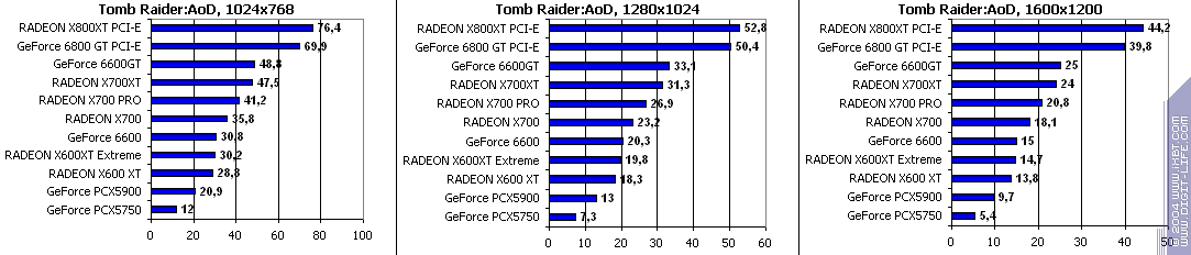 - Tomb Raider: Angel of Darkness v.49 (Core Design/Eldos Software) — DirectX 9.0, Paris5_4 demo. Тестирование проводилось при максимально установленном качестве, выключены были лишь Depth of Fields PS20.