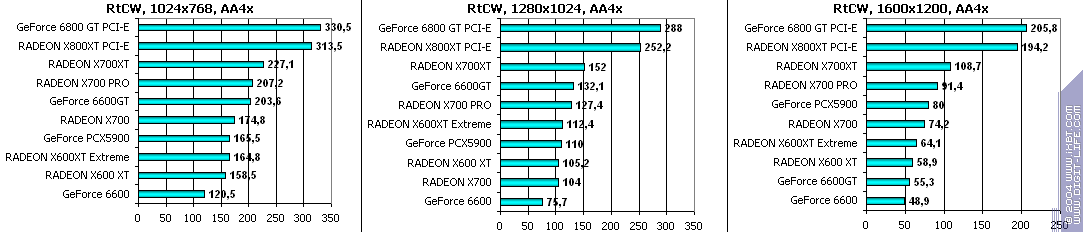 - RADEON X700 PRO — против GeForce 6600GT — и опять картина, которую мы уже видели: в 1600х1200 при дополнительной нагрузке детище ATI лидирует. Но в данном случае при таких значениях FPS это даже очень важно, ибо играбельность остается на уровне даже при АА+АФ.