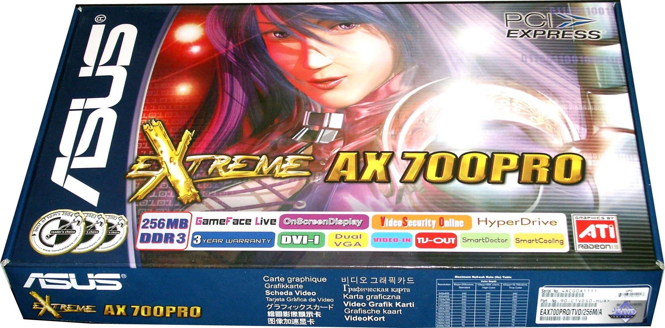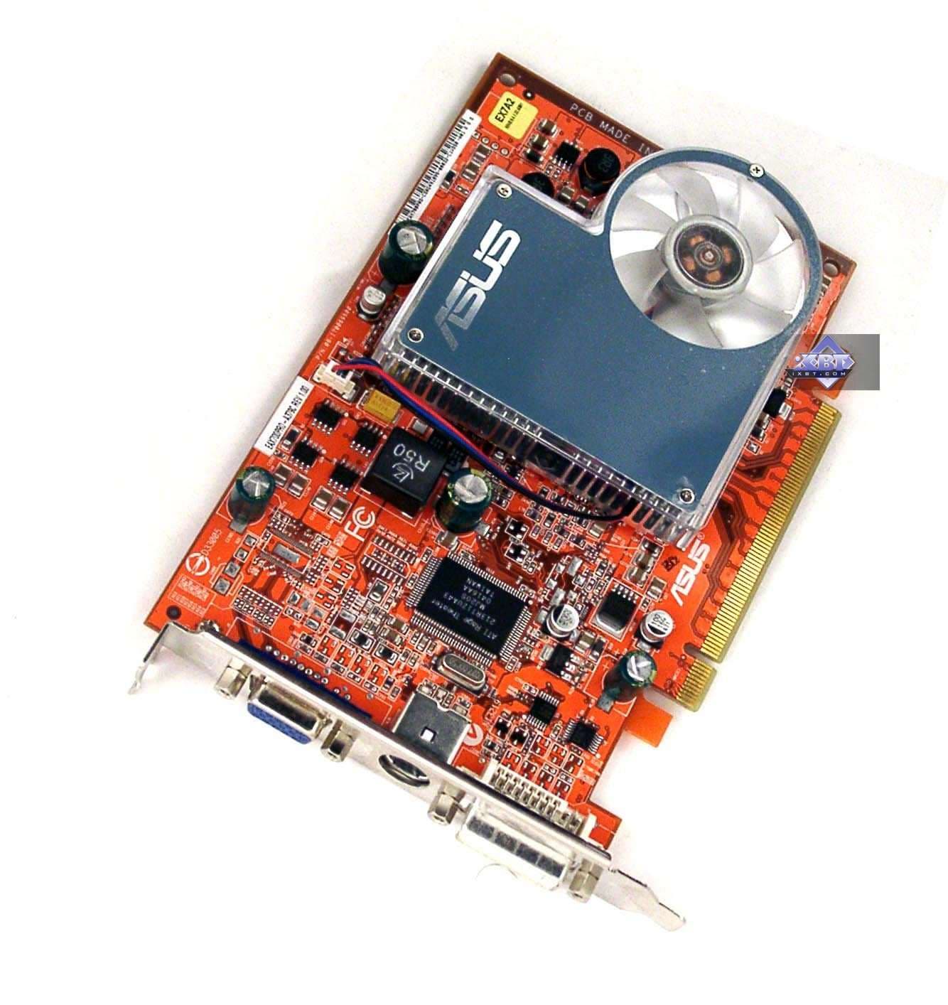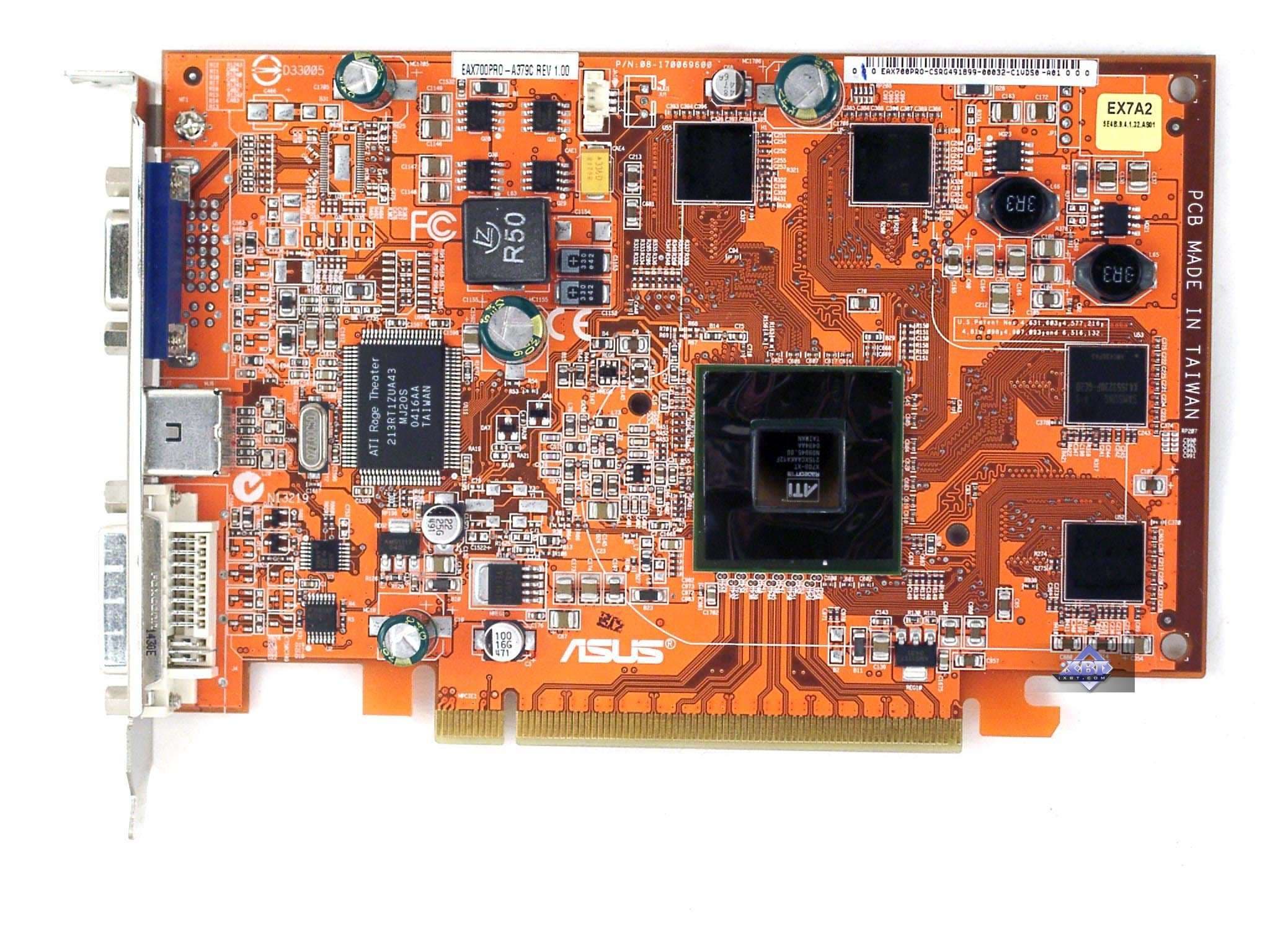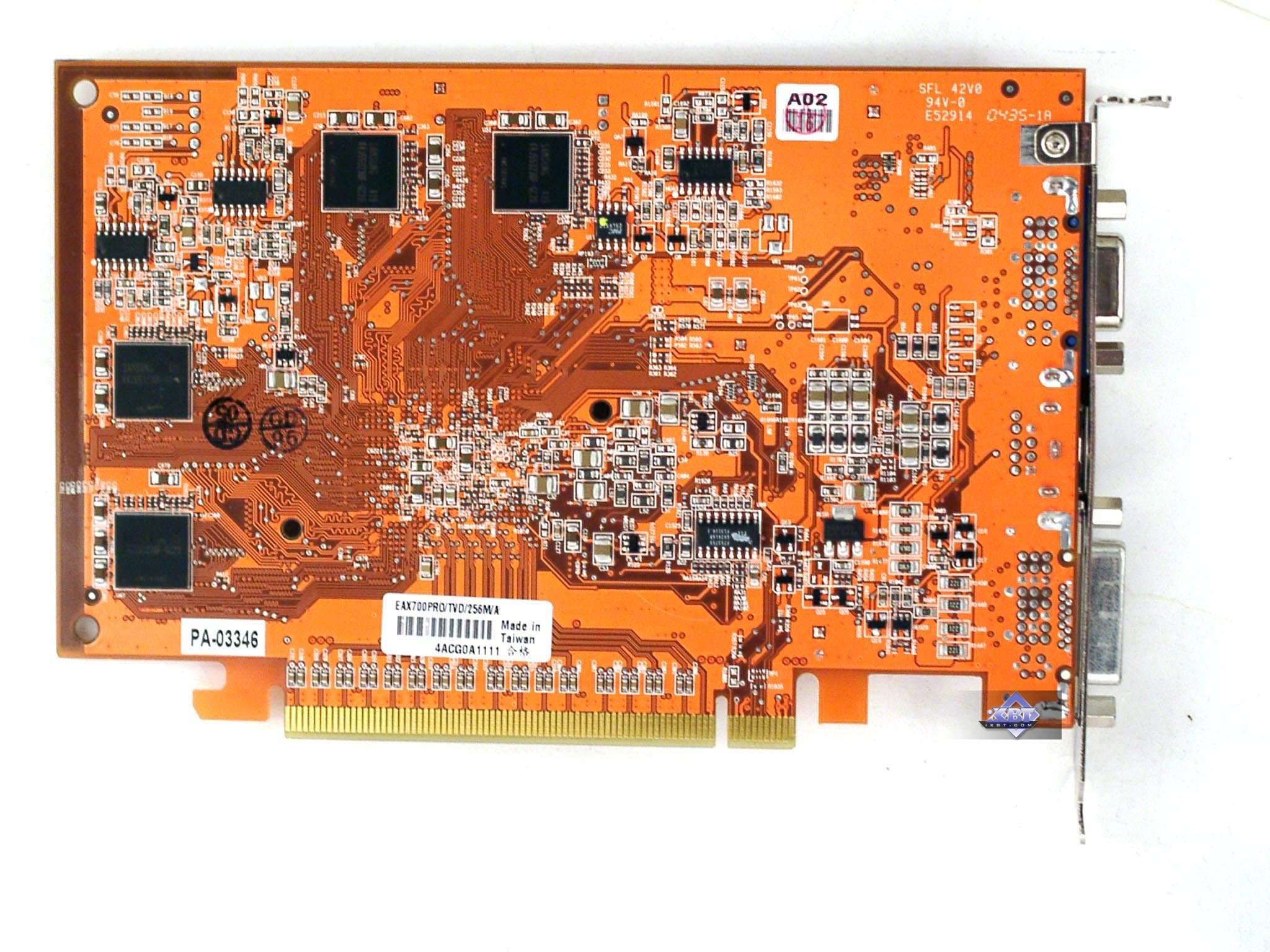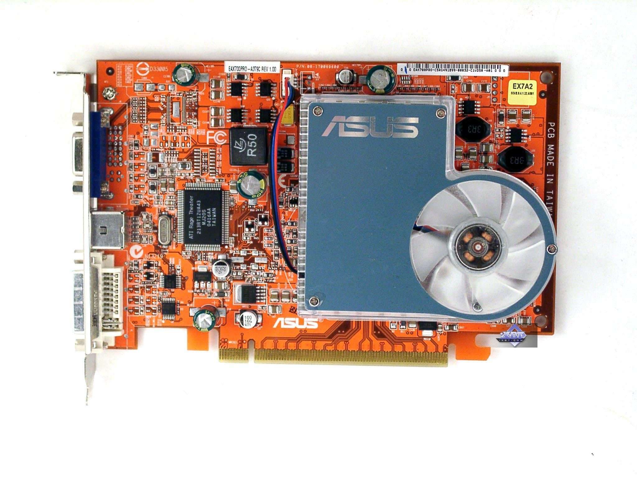 - ASUS Extreme AX700PRO 256MB — прекрасный стильный дизайн, кулер с подсветкой. Только цена высоковата, да и комплект почти никакой. К плюсам можно отнести наличие VIVO. Качество 2D в 1600х1200 при 85 Гц — хорошо. Разгон отличный, на частотах X700 XT может легко работать.