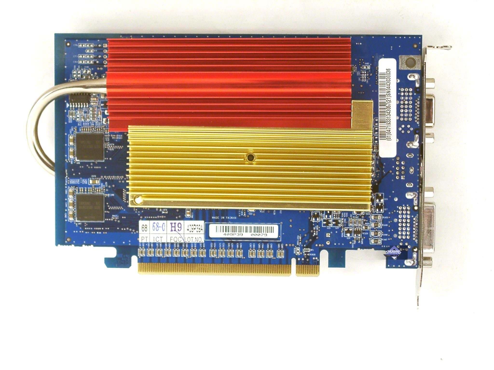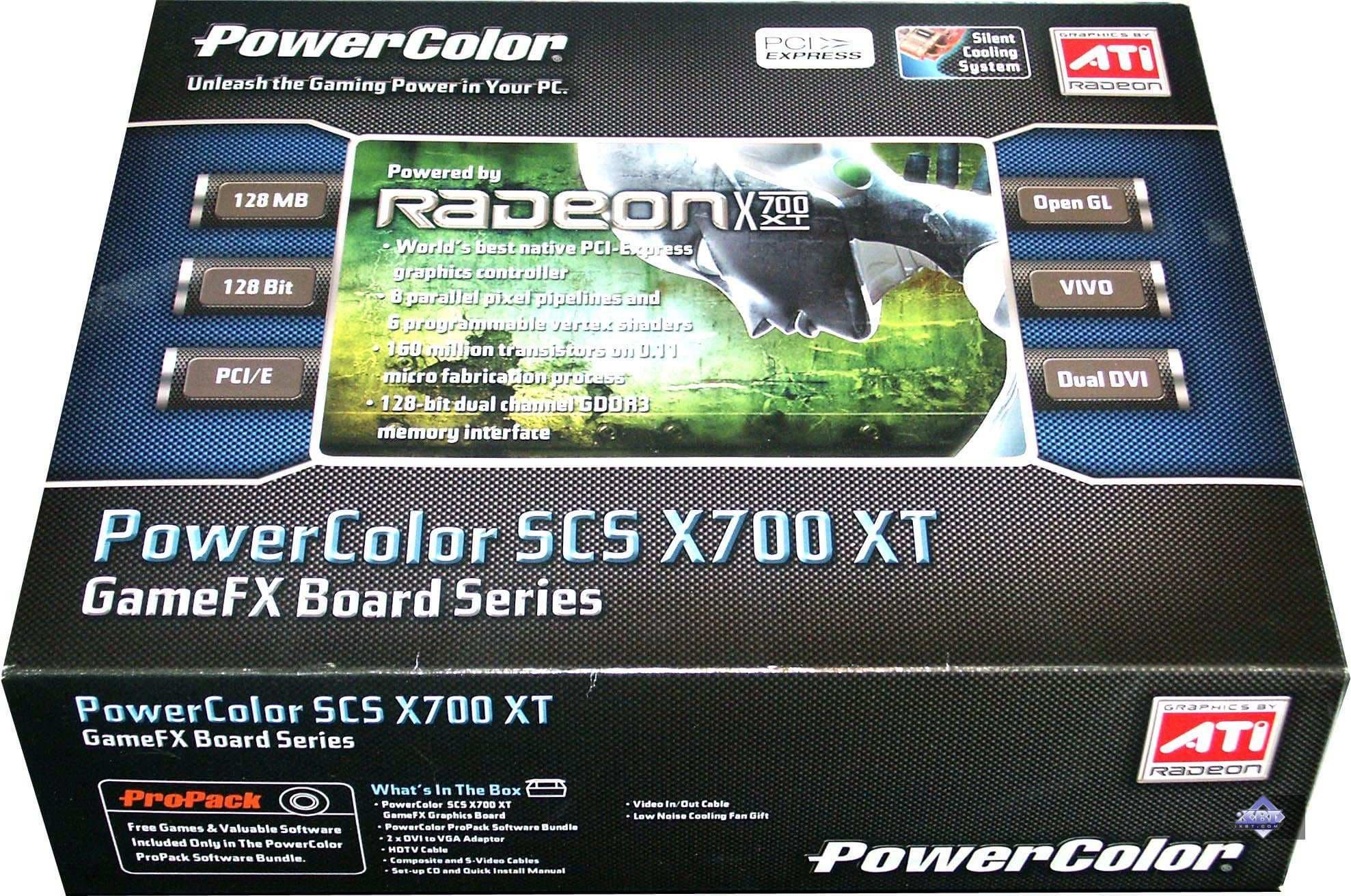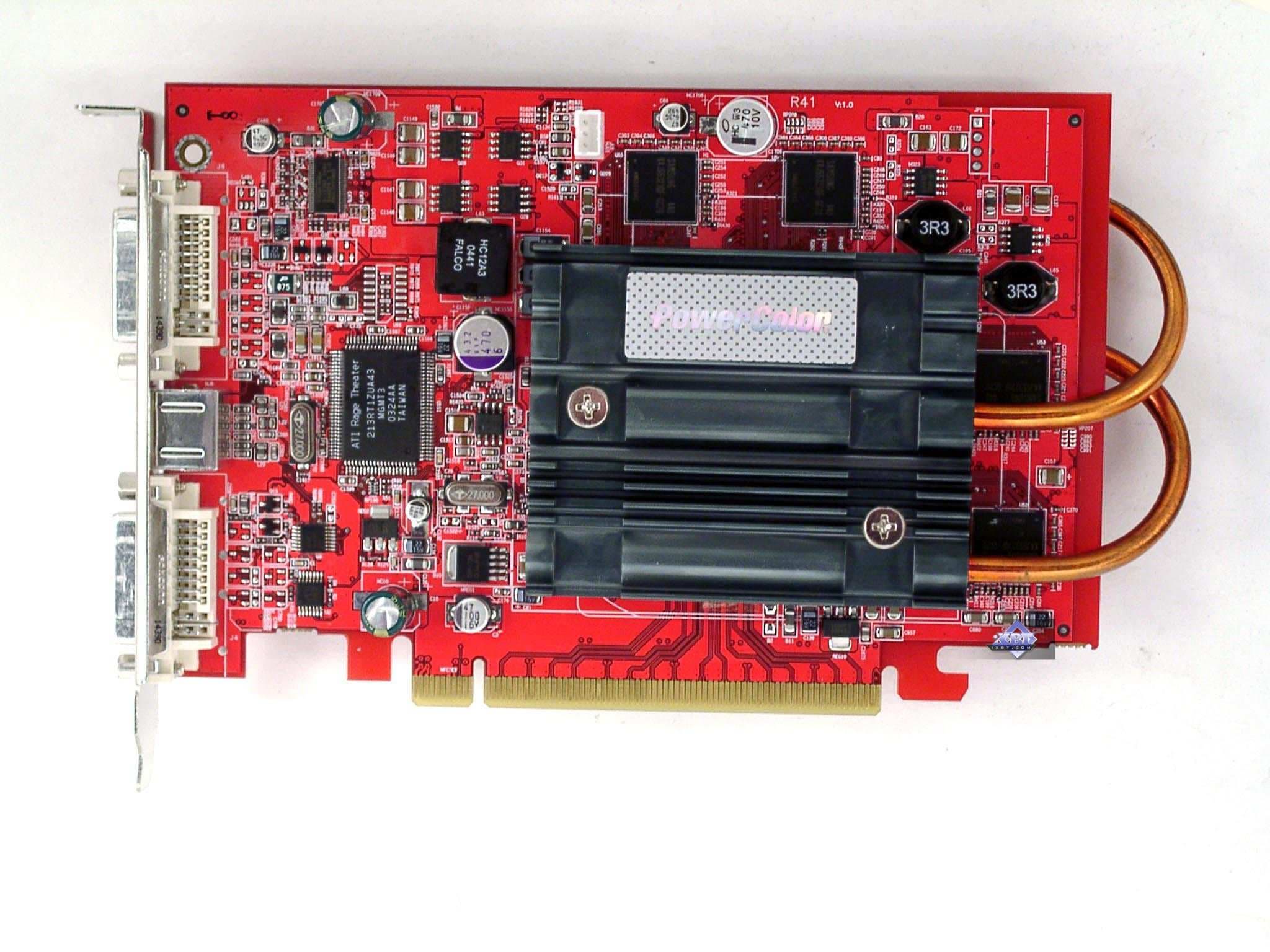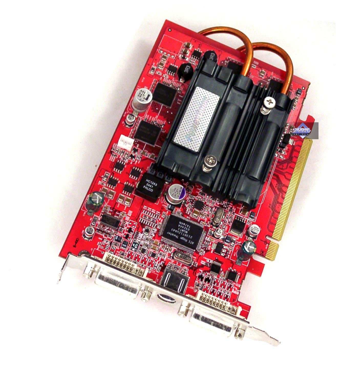 - PowerColor RADEON X700 XT 128MB — прекрасный дизайн. Если корпус хорошо продувается, то нет смысла ставить на карту вентилятор, ее штатные радиаторы способны хорошо справиться со своей задачей. Имеется VIVO. Качество 2D в 1600х1200 при 85 Гц — хорошо. Разгон — 500/1110 МГц.