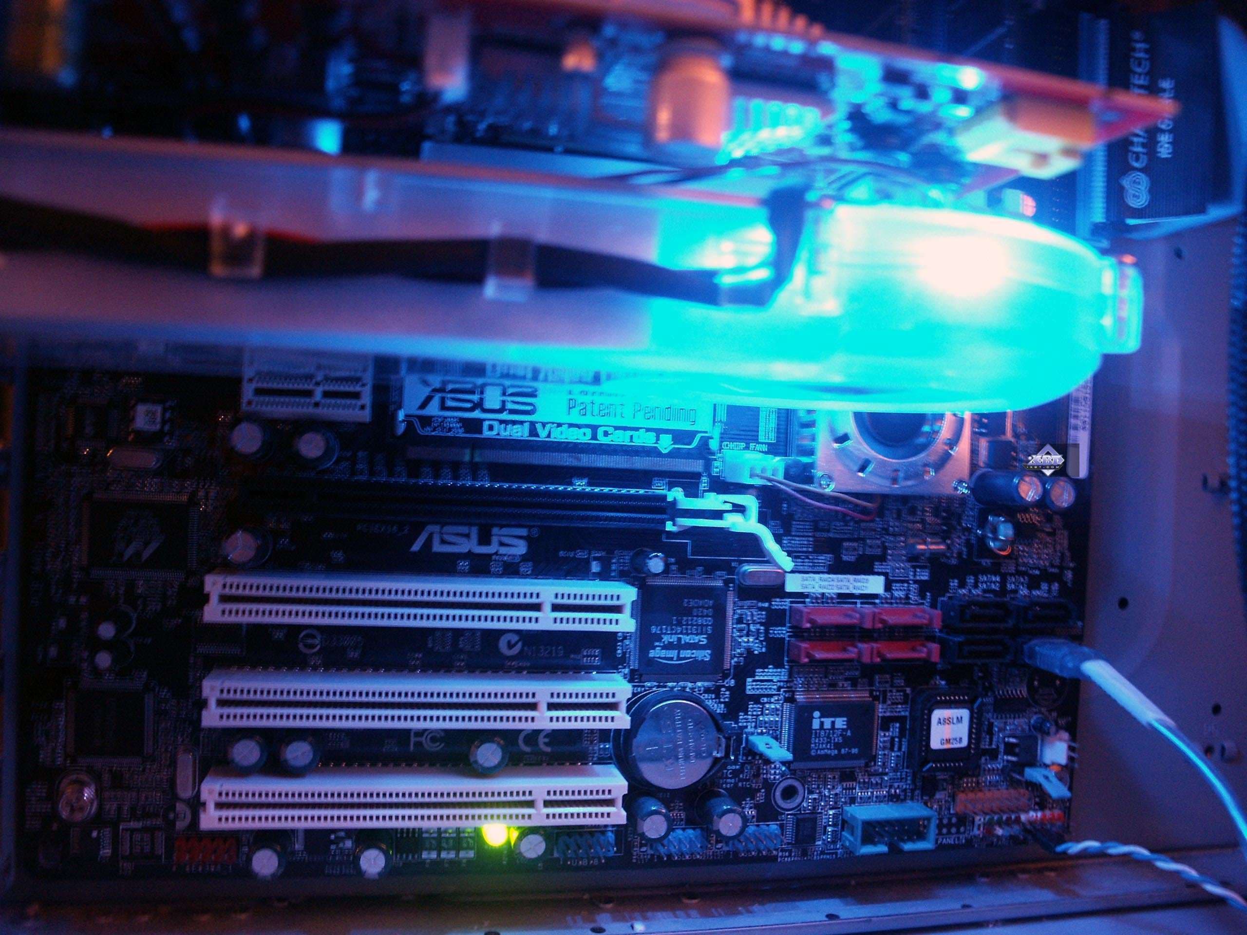 Но это еще не все. У кого нет внутри системного блока ультрафиолетовой подсветки, для тех есть иной источник свечения: светодиоды на самом вентиляторе.