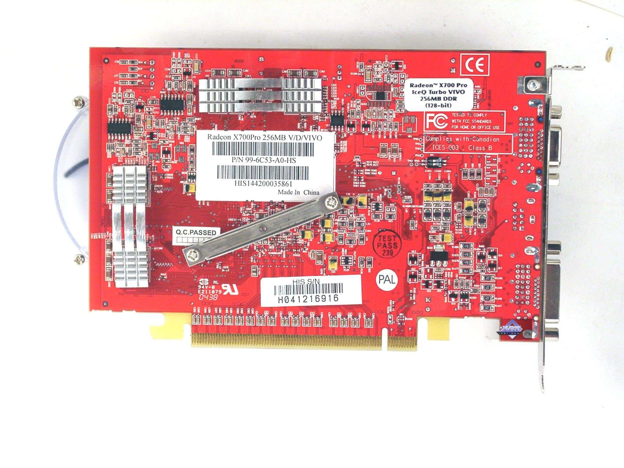 - HIS RADEON X700 PRO IceQ Turbo 256MB — уникальный дизайн с тихим кулером, который точно понравится любителям моддинга. Имеется VIVO. Из минусов — кулер занимает два слота (но пока это неактуально). Качество 2D в 1600х1200 при 85 Гц — хорошо. Разгон до 490/1120 стабильный, что является рекордом среди таких карт.