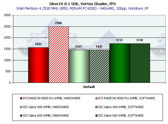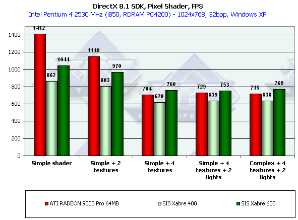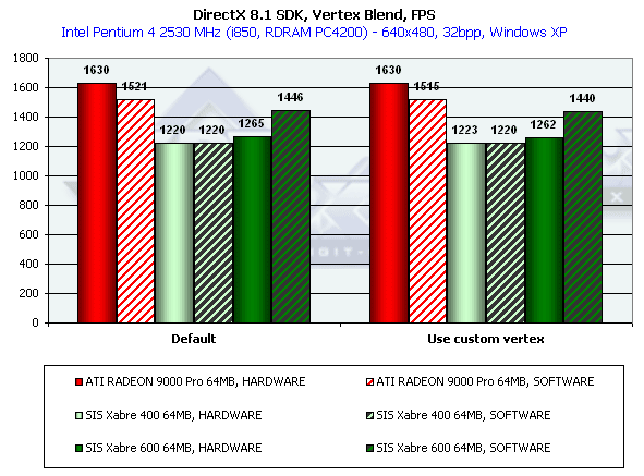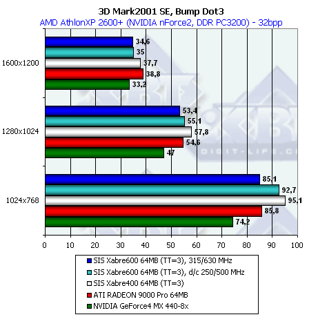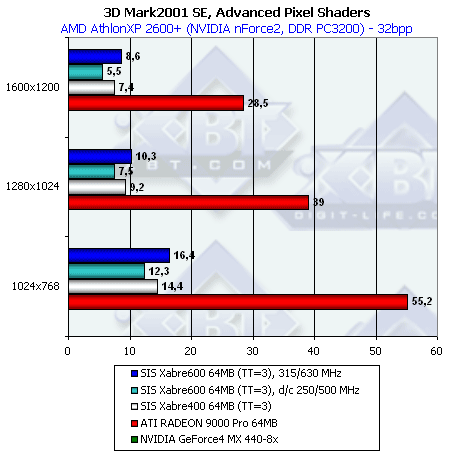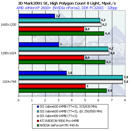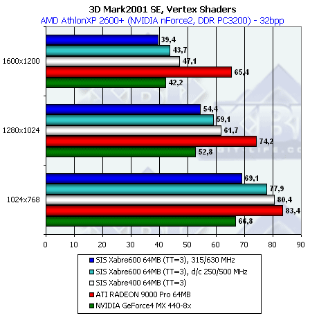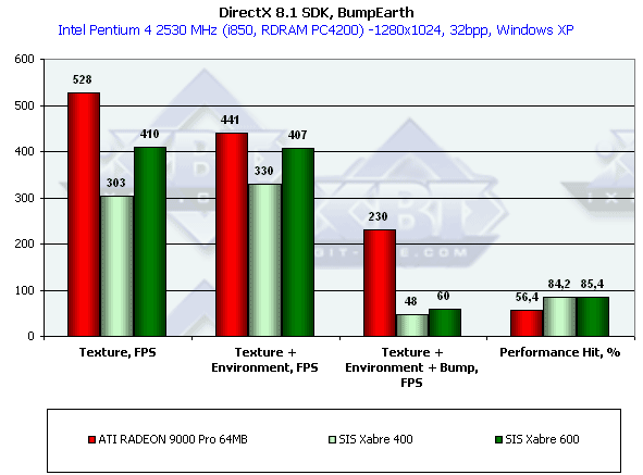 В отличие от нашего теста DX SDK, здесь все варианты Xabre показывают себя очень плохо. В чем же дело? Видимо, используются EMBM-содержащие пиксельные шейдеры — а мы уже хорошо заметили, насколько тяжело они даются продуктам SIS. Что-ж такая трактовка тоже имеет право на жизнь. Переформулируем: пиксельные шейдеры SIS очень неплохи, но до тех пор, пока дело не касается EMBM.