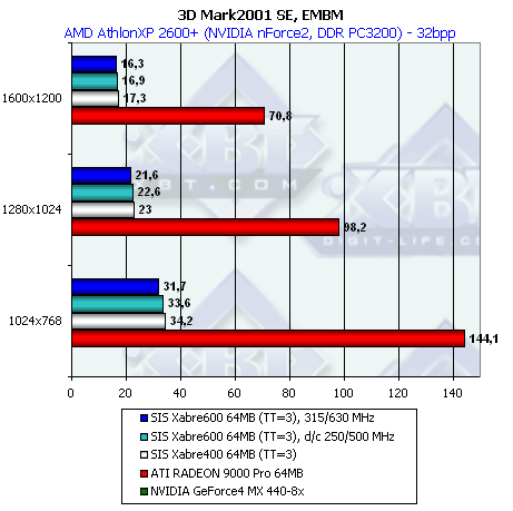 EMBM есть, но падение просто ужасающее. Можно сказать, что EMBM просто нет. В области обычного текстурирования и обычных карт среды все более-менее нормально. Чуть медленее Radeon, но быстрее предыдущего Xabre 400.