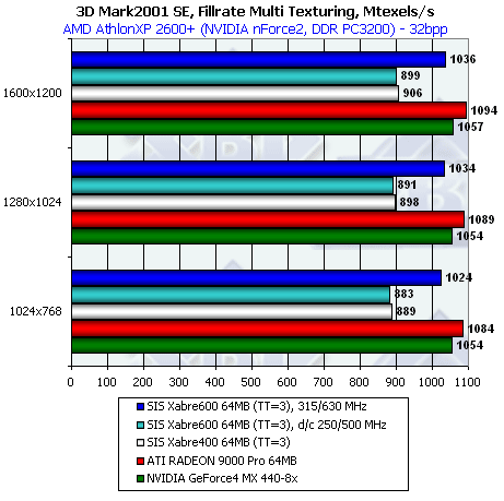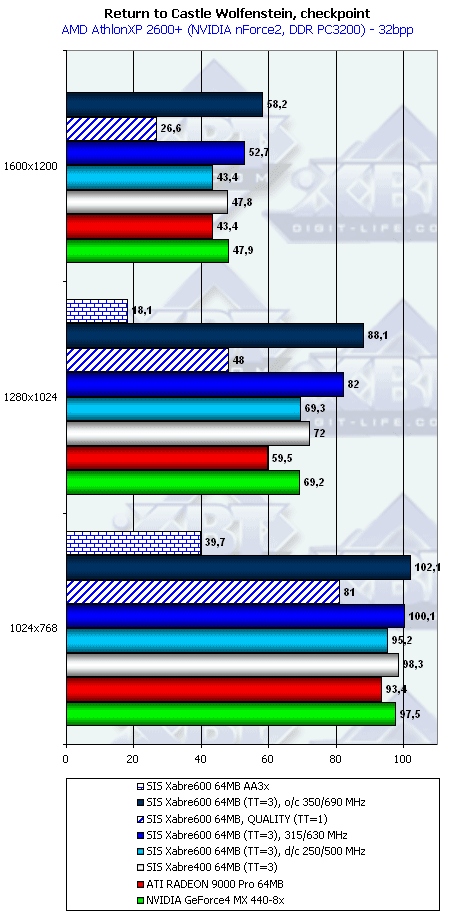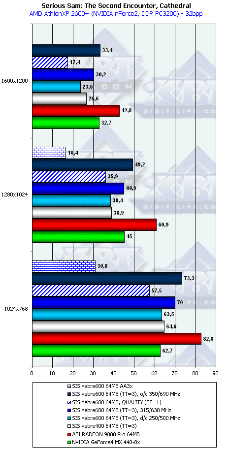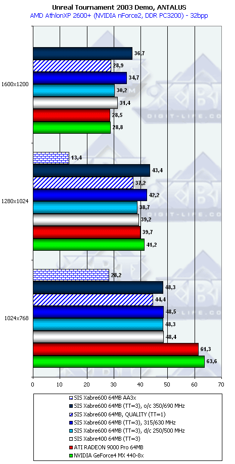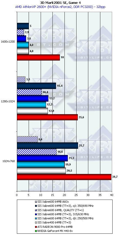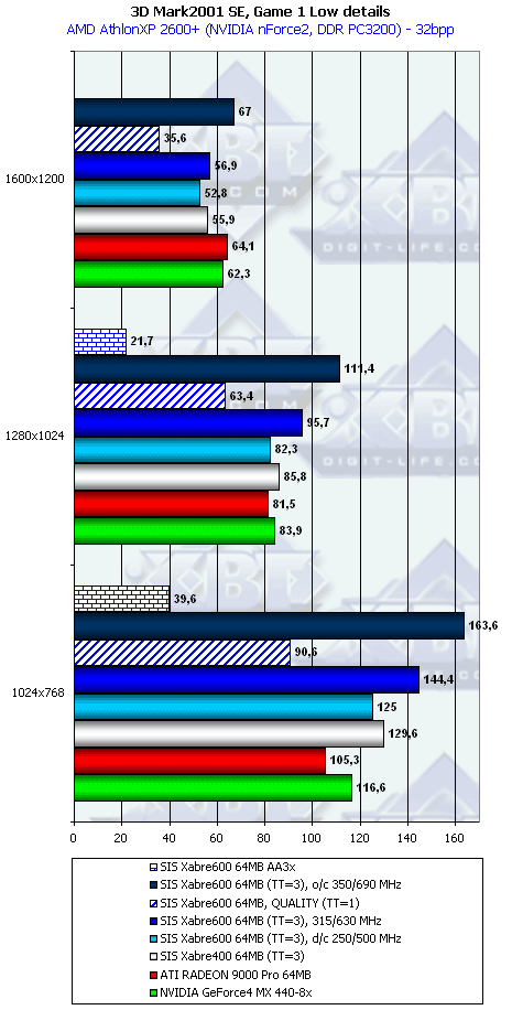 Если при ТТ=3 Xabre 600 еще и лидирует (кроме 1600х1200), то при ТТ=1 новичок уже проигрывает RADEON 9000 Pro и GeForce4 MX440-8x.