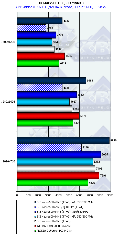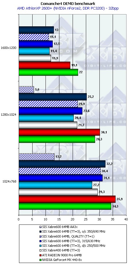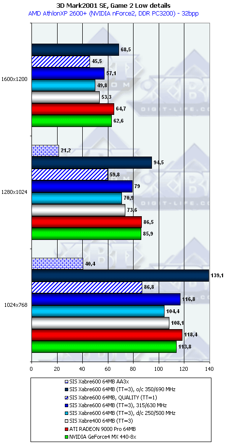 Пока не получается из Xabre 600 "убийцы" ни RADEON 9000 Pro, ни GeForce4 MX440-8x. В большинстве случаев мы видим проигрыш. И надо сказать, что ведь тесты конкурентов проводились при максимальной детализации как текстур, как и в целом самого высокого качества 3D в настройках драйверов, поэтому справедливости ради надо сравнивать работу Xabre 600 тоже при ТТ=1, а тут вообще полный провал.