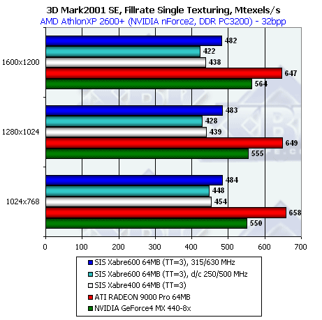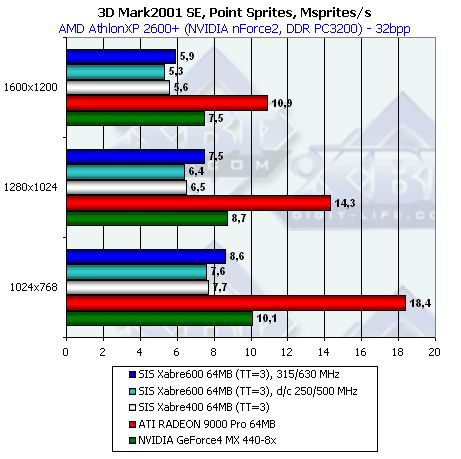А тут уже мы видим, что RADEON 9000 Pro вне конкуренции, соперничество Xabre 600 идет только с GeForce4 MX440-8x.