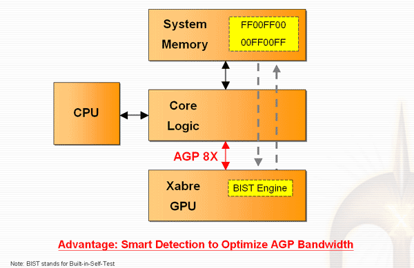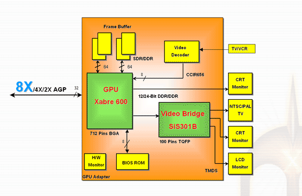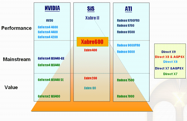 На обобщенной блок-схеме карты на базе Xabre 600 мы не видим ничего нового, те же два 64-битных контроллера памяти, внешний сопроцессор 301 со вторым RAMDAC и кодеком TV-out и т.д. SIS позиционирует новый продукт как соперника GeForce4 MX и RADEON 9000 Pro. Соперника, который должен превосходить конкурентов и подбирается к сектору Performance: