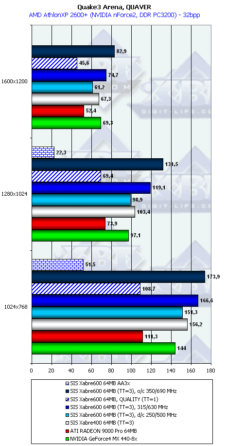 Любопытно, как отлажен ICD OpenGL у Xabre под Quake3 :-), вот тут мы видим победу новичка над соперниками. И даже при ТТ=1 карта идет вровень с RADEON 9000 Pro.