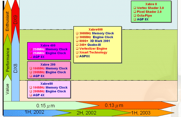 - Xabre 200 (0.15мкм) — также малопопулярен из-за низкой производительности и высокой цены для такого уровня, частота ядра 200 МГц, памяти 166 (333) МГц DDR DRAM, AGP 8x;