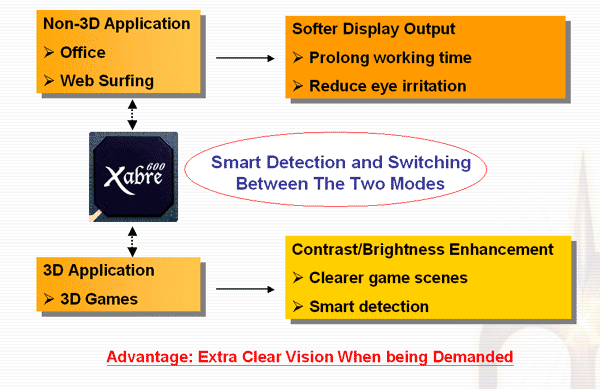 Это нечто подобное DVC NVIDIA, то есть система увеличения яркости и насыщенности изображения с помощью аппаратной постобработки сигнала. У этой технологии есть один явный плюс: увеличение яркости в играх, особенно в тех, где преобладают темные тона и часто приходится корректировать цветовую гамму под такие игры. В случае офисных приложений, технология наоборот старается сделать изображение не кричащим, а значит и менее утомляющим глаза.