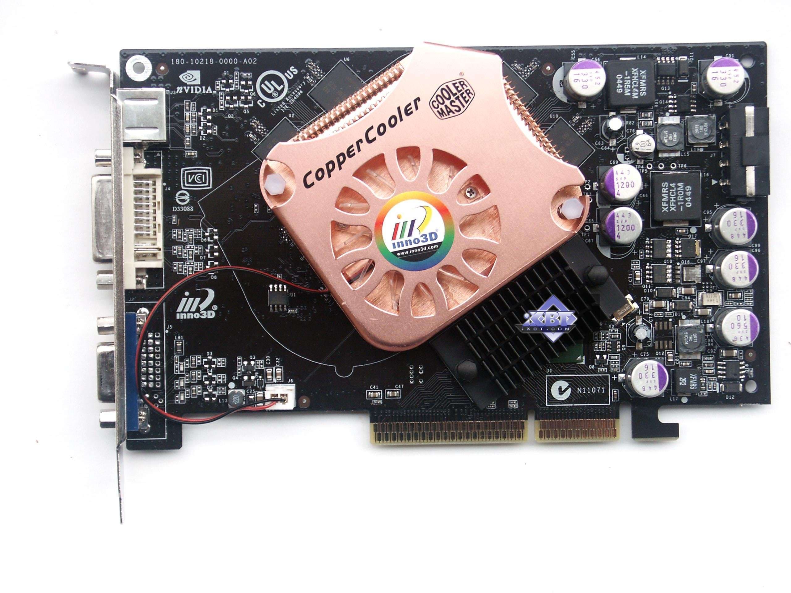 - Inno3D GeForce 6800 Premium Edition AGP 128MB — продукт для уходящего со сцены AGP-сектора. Уже имеет солидный возраст, однако до сих пор весьма актуален. И не забываем, что карты основаны на NV40, и потому есть шанс разблокировать конвейеры с помощью RivaTuner, и получить, по сути, почти 6800 GT, но со 128-ю мегабайтами памяти, работающей на более низких частотах. Продукт исполнен отлично, нареканий нет. Конечно, поставка кулера отдельно от карты накладывает свои минусы (можно забыть о нем при получении платы со склада), и малопонятно, почему нельзя было одеть кулер еще на заводе (ширина упаковки легко позволяет уместить туда карту в сборе). Ведь базовые крепежи все же одеты…