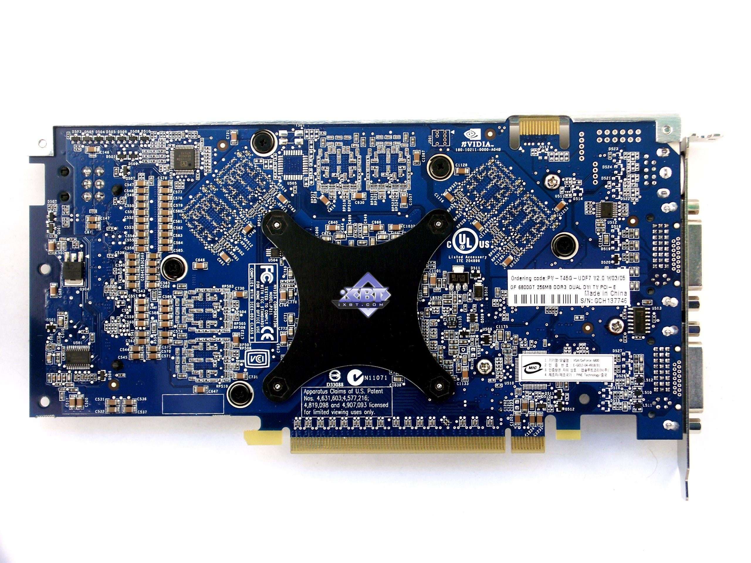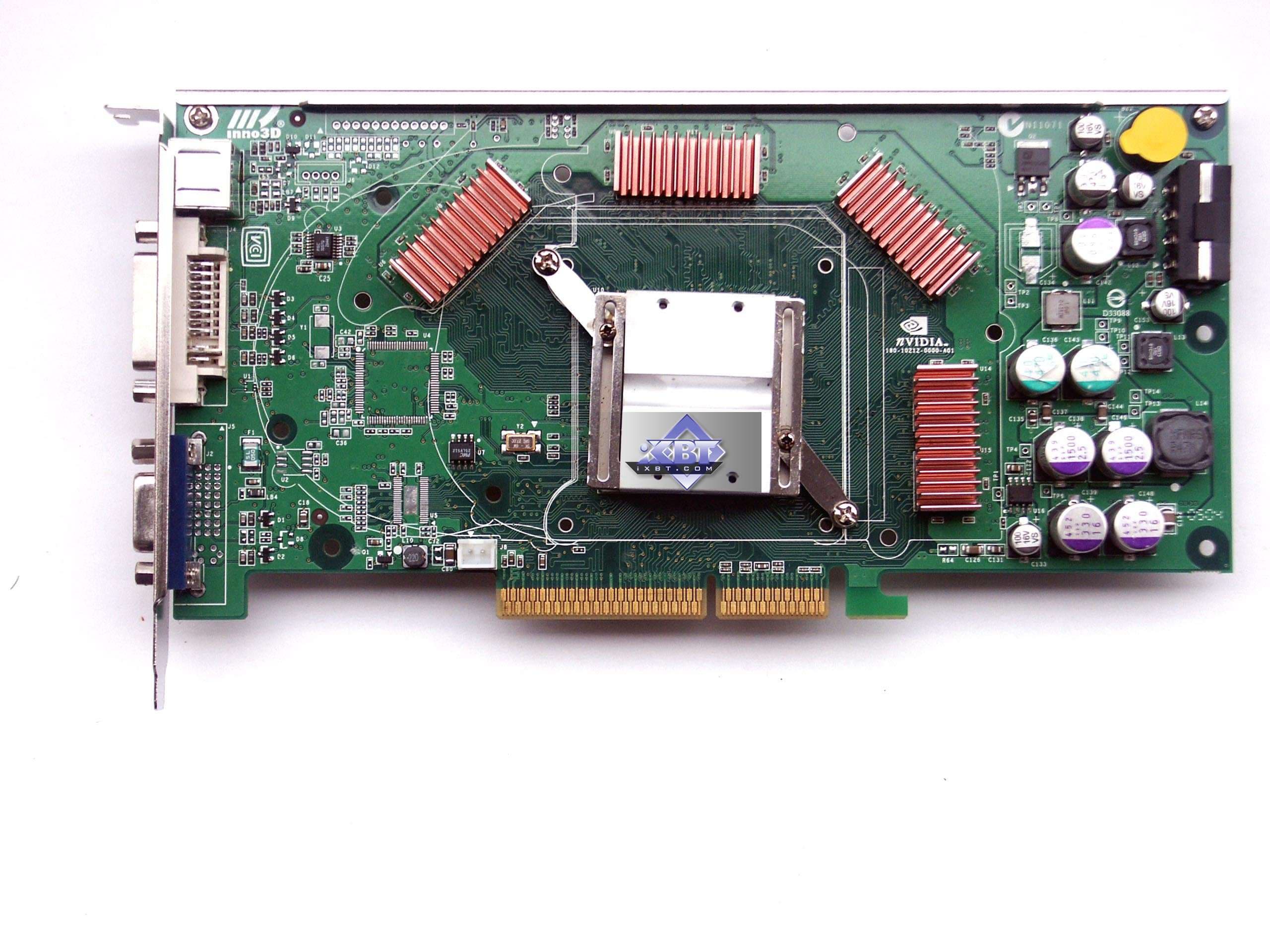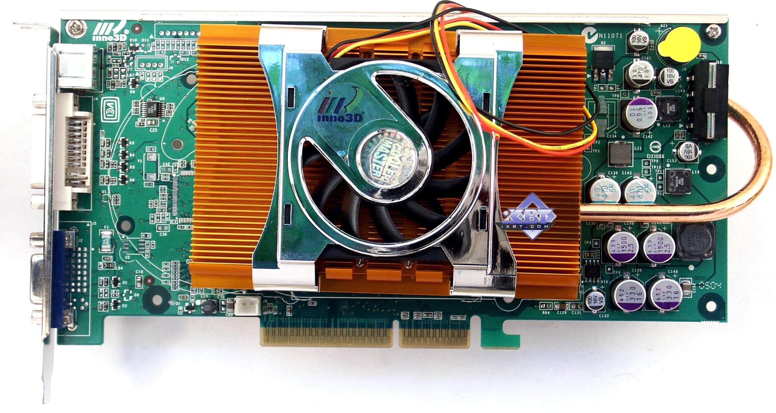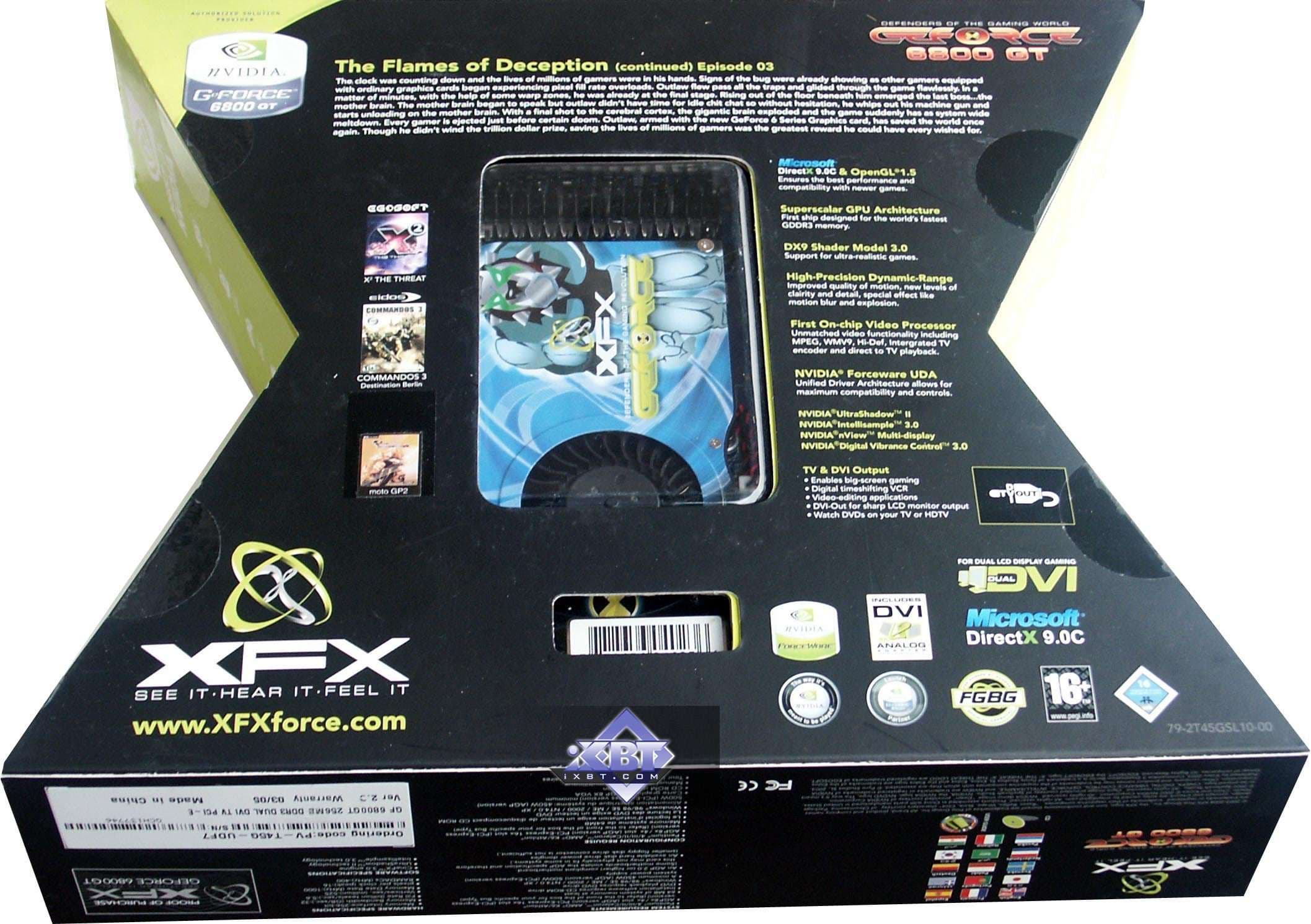 - XFX GeForce 6800 GT PCI-E 256MB — изделие, которое может легко составить конкуренцию более дорогому предыдущему продукту, поскольку разгон подобных карт вполне позволяет достичь частот, близких к 6800 Ultra. А цена весьма сильно меньше. По всем остальным параметрам карта не имеет нареканий, работоспособность отличная, качество в 2D отменное. И такой же минус в отношении планки жесткости, которая не дает доступа к разъему SLI.