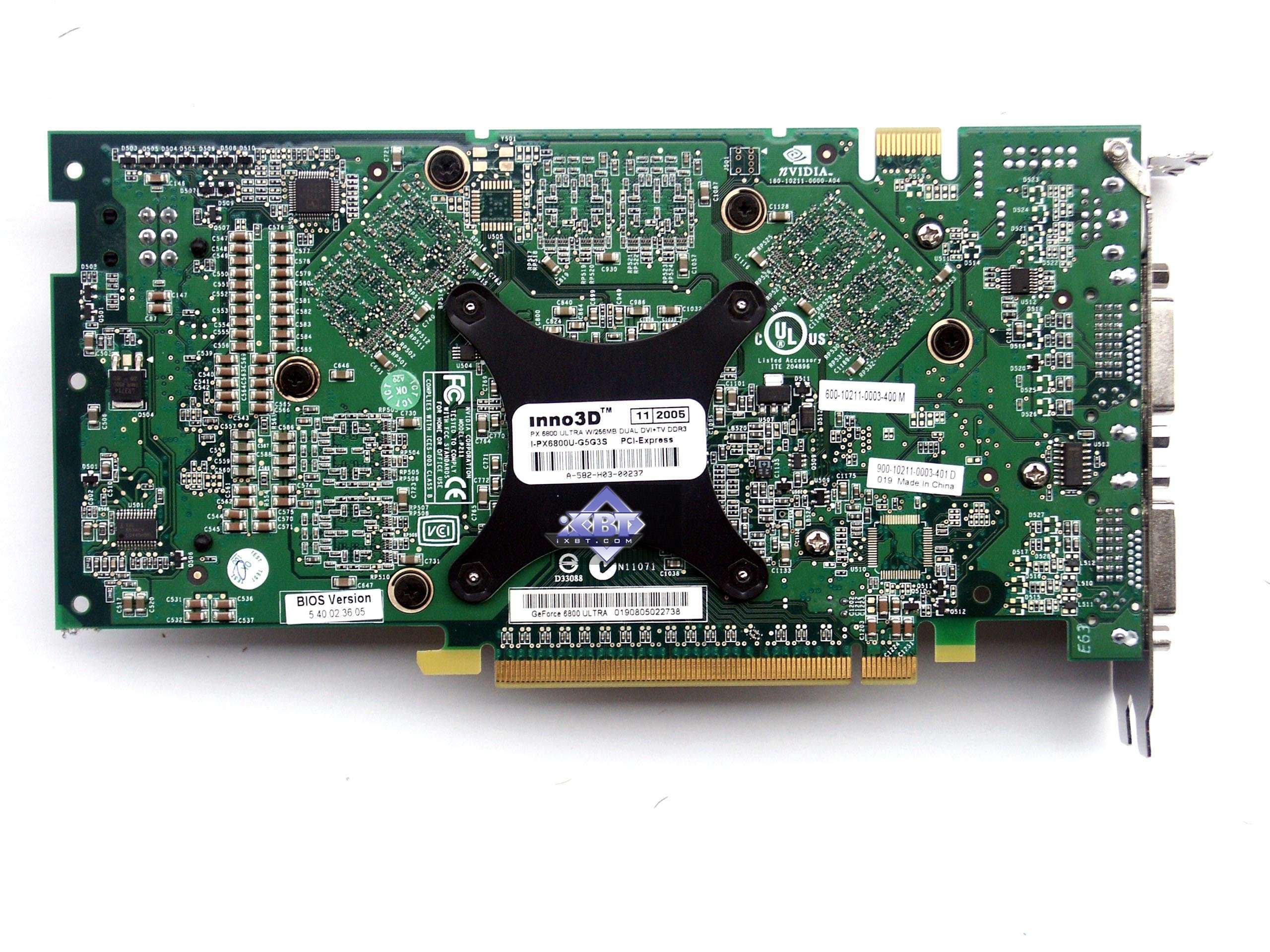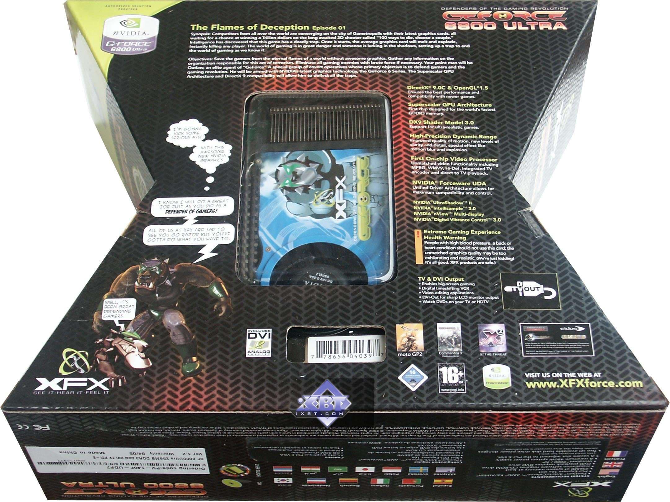 - XFX GeForce 6800 Ultra PCI-E 256MB — аналогично первому выводу. Также приятно, что частота ядра 425 МГц, цена упала весьма сильно, поэтому продукт может стать привлекательным. Поскольку это тоже reference card, изготовленная по заказу NVIDIA, то качество очень высокое, нареканий нет. Минусом является отсутствие разреза для разъема SLI в верхней планке жесткости, поэтому для использования карты в SLI придется снимать всю планку.