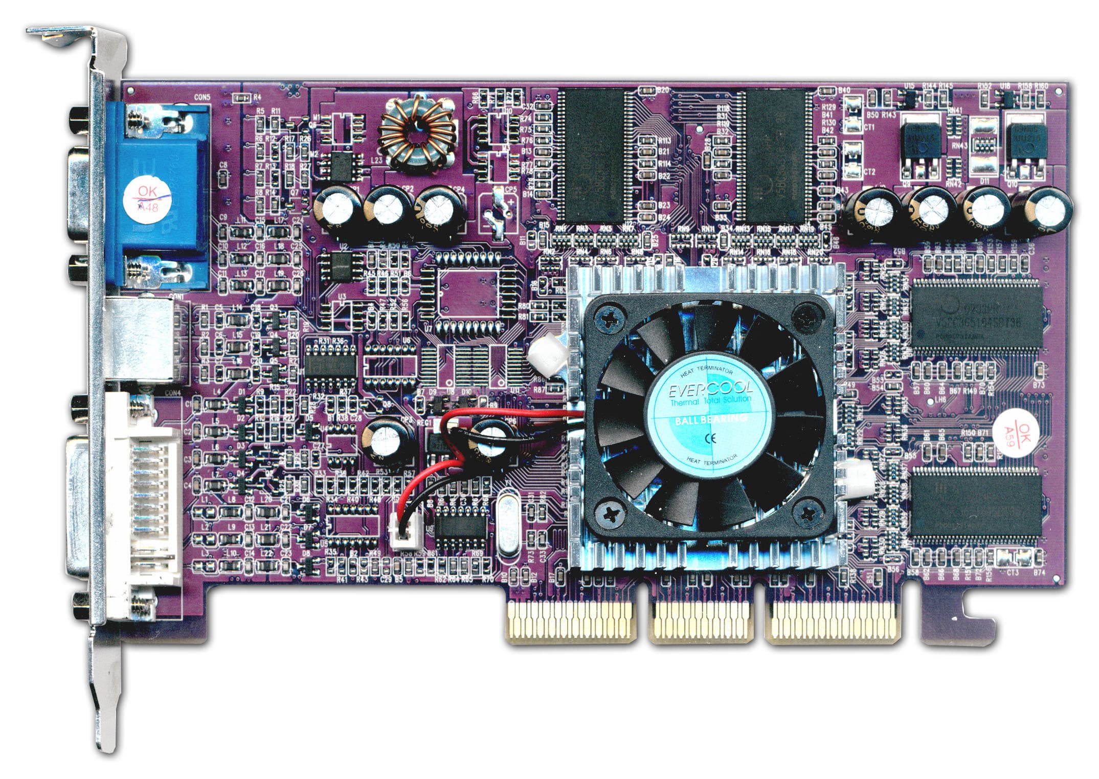 Если о видеокарте XpertVision RADEON 9700 PRO сказать особо нечего, всем и так видно, что перед нами копия эталонной карты, то XpertVision RADEON 9000 выполнен на дизайне PCB собственной разработки. Впрочем, если вспомнить про Palit, то мы почти всегда видели их карты на уникальном дизайне, который сильно отличался от эталонного от NVIDIA. Просто чувствуется, что дух Palit переходит и на карты от YUAN, особенно этот темно-фиолетовый цвет PCB…