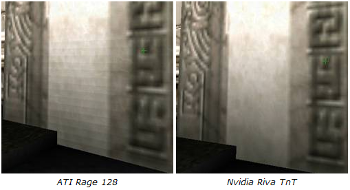 К сожалению, неудача постигла и реализацию технологии мип-мэппинга, выбирающую текстуры уменьшающегося разрешения по мере удаления от наблюдателя: мип-уровни, в рамках которых использовалась текстура меньшего разрешения, часто шли в неверном порядке. Если вблизи все было достаточно благопристойно, то на дальних мип-уровнях, обработанных Rage 128, можно было увидеть откровенное безобразие. Разумеется, лишь если присмотреться — в жарких батальных сценах обратить внимание на подобное вряд ли возможно.