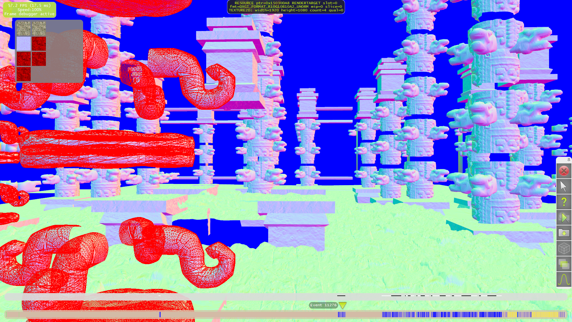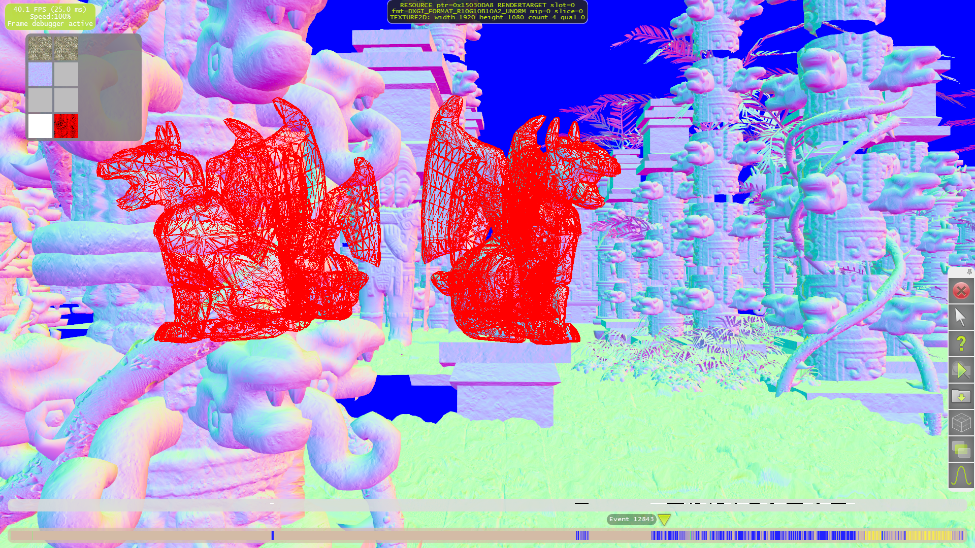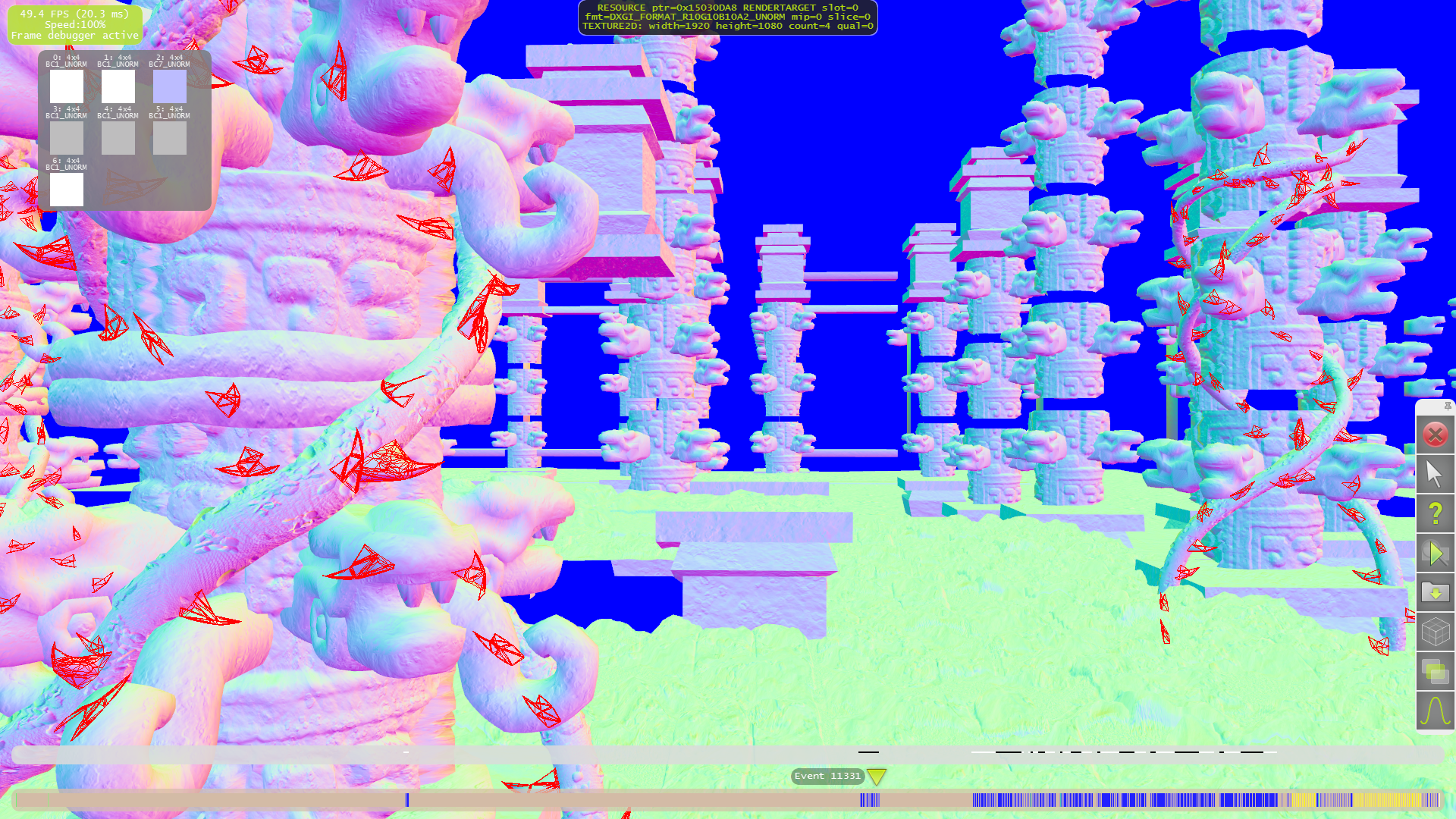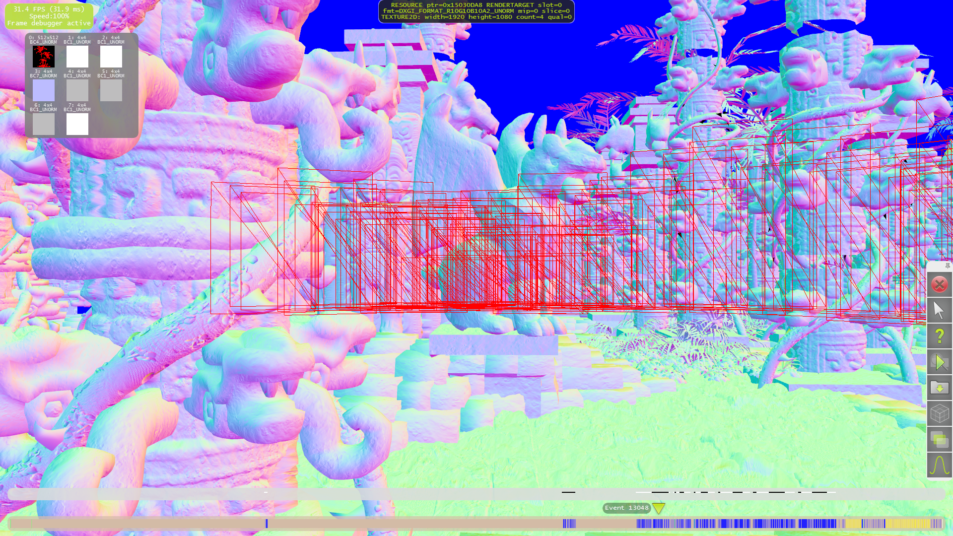 Для начала разберём тесселяцию. Как видно на следующих примерах, только для нескольких объектов на переднем плане применяются высокие степени разбиения. А на средних и дальних дистанциях геометрической детализации явно не хватает. Что приводит к выводу о том, что выбранная схема детализации (LOD) весьма странная — размер дальних треугольников слишком большой, а ближних — порой (но далеко не всегда) слишком маленький.