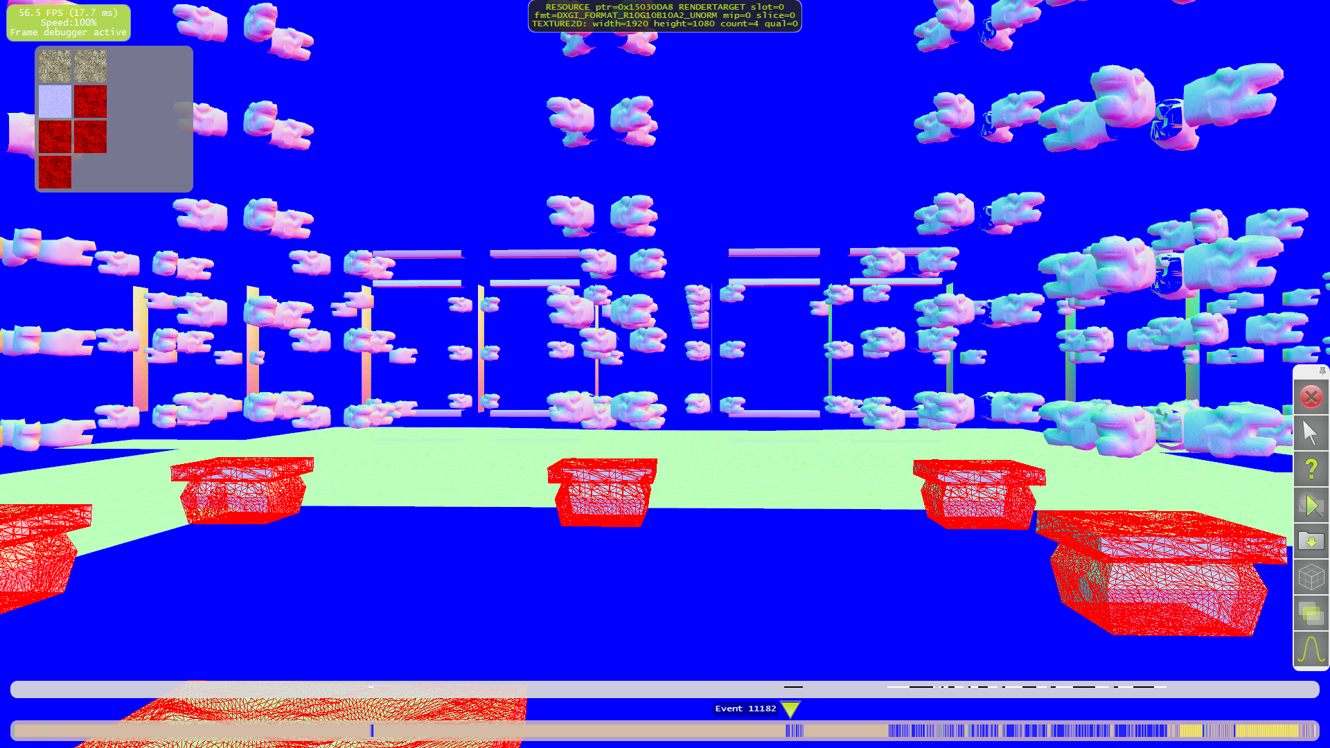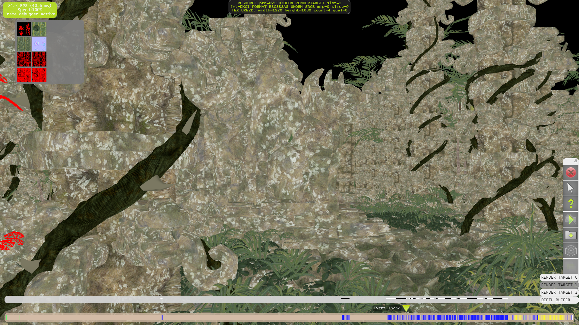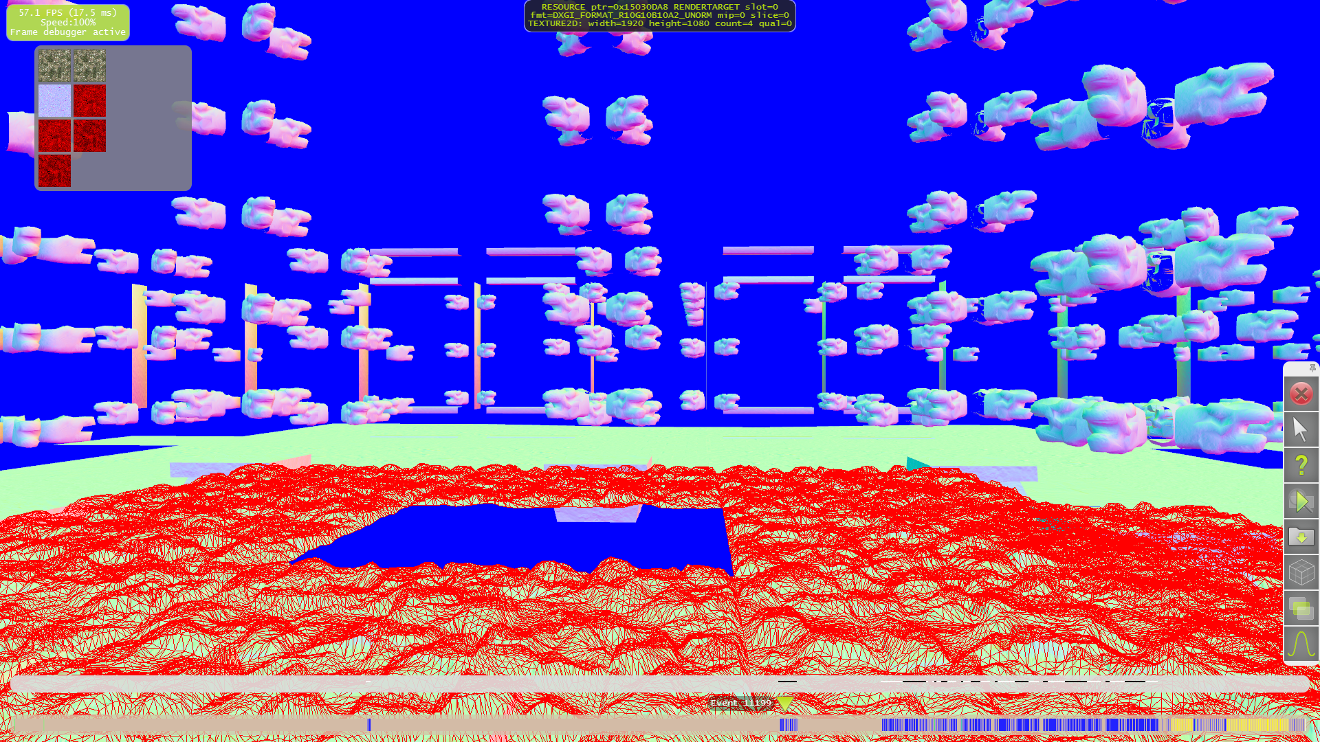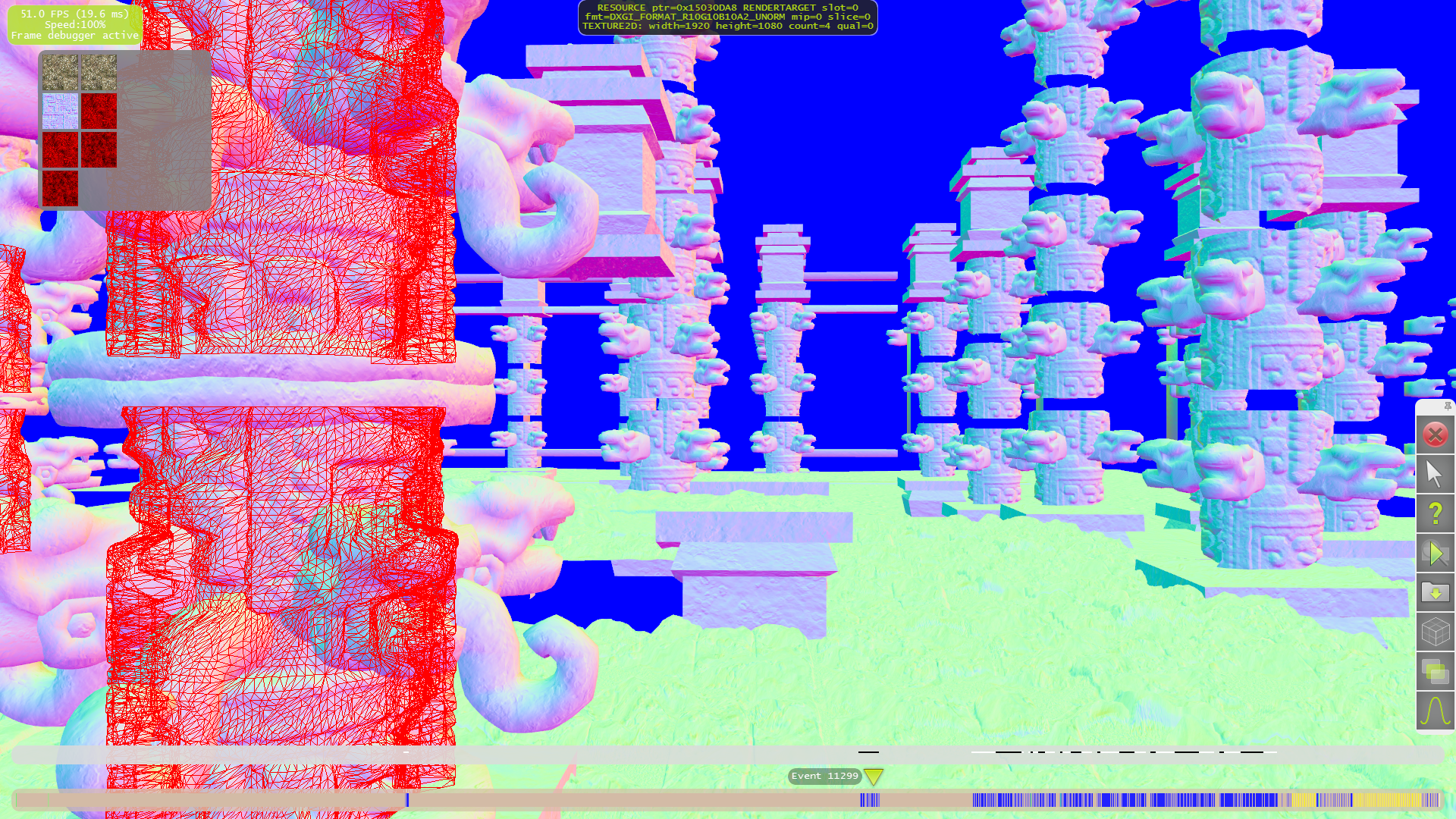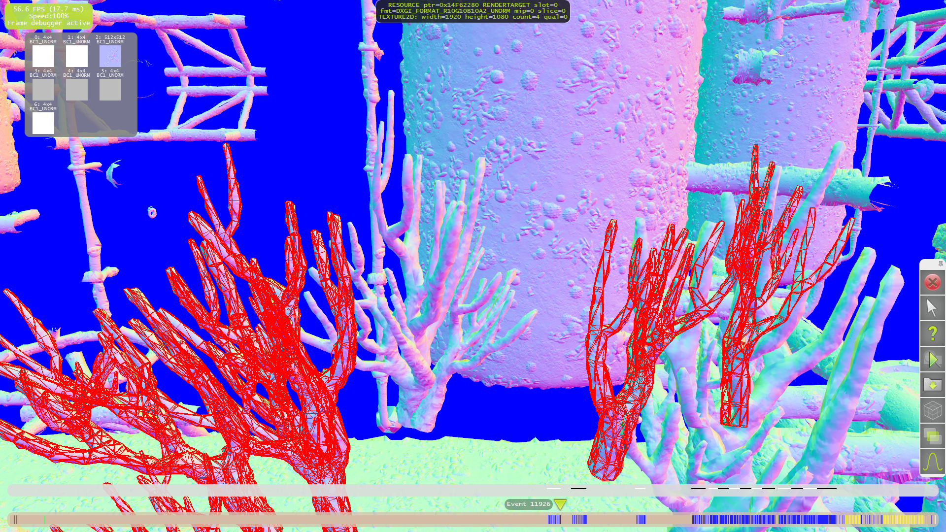 Для начала разберём тесселяцию. Как видно на следующих примерах, только для нескольких объектов на переднем плане применяются высокие степени разбиения. А на средних и дальних дистанциях геометрической детализации явно не хватает. Что приводит к выводу о том, что выбранная схема детализации (LOD) весьма странная — размер дальних треугольников слишком большой, а ближних — порой (но далеко не всегда) слишком маленький.