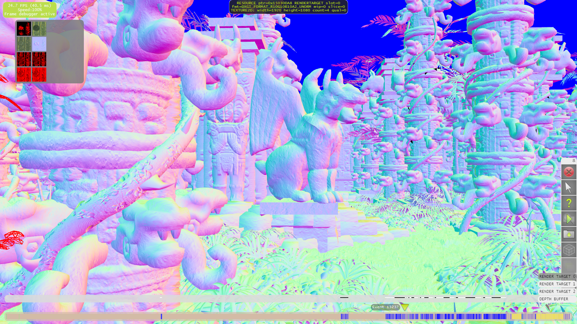 Форматы у этих буферов следующие: Diffuse и Specular — DXGI_FORMAT_R8G8B8A8_UNORM_SRGB, Normal — DXGI_FORMAT_R10G10B10A2_UNORM, Ambient Occlusion — DXGI_FORMAT_R8_UNORM, Depth — DXGI_FORMAT_R32_TYPELESS.