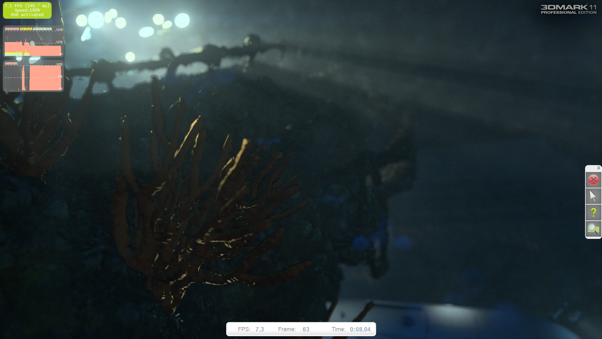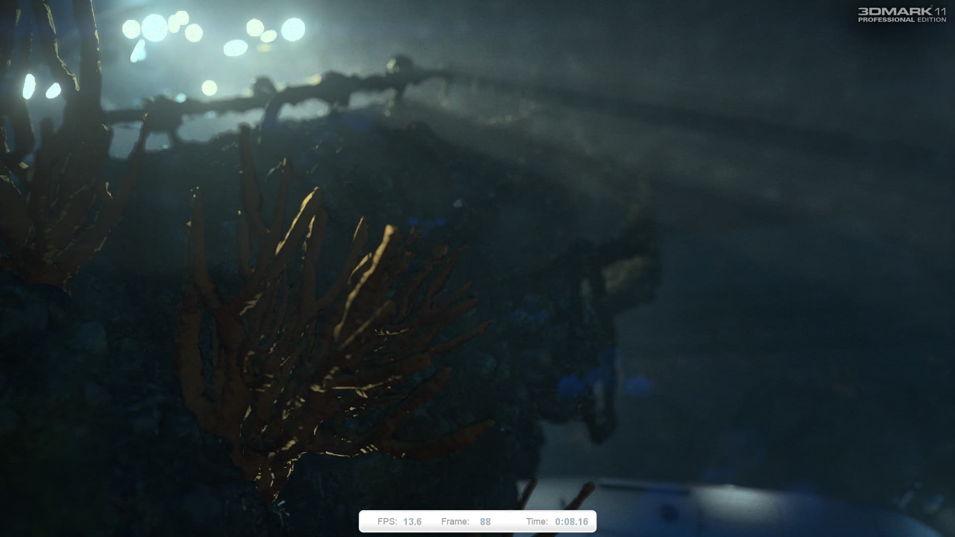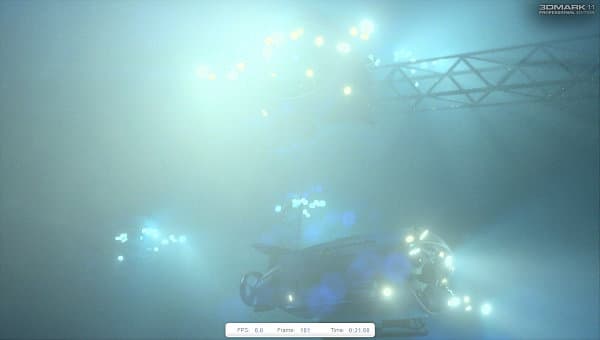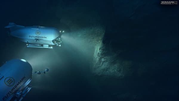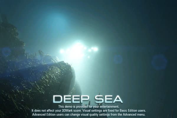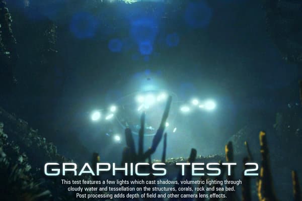 Первый тест основан на сцене «Deep Sea», в нём используется очень тяжёлое освещение с большим количеством источников света, отбрасывающих тени. В тесте очень много объёмного освещения (volumetric illumination), хорошо заметного в непрозрачной воде, и совершенно нет тесселяции. Постобработка включает некоторые оптические эффекты.