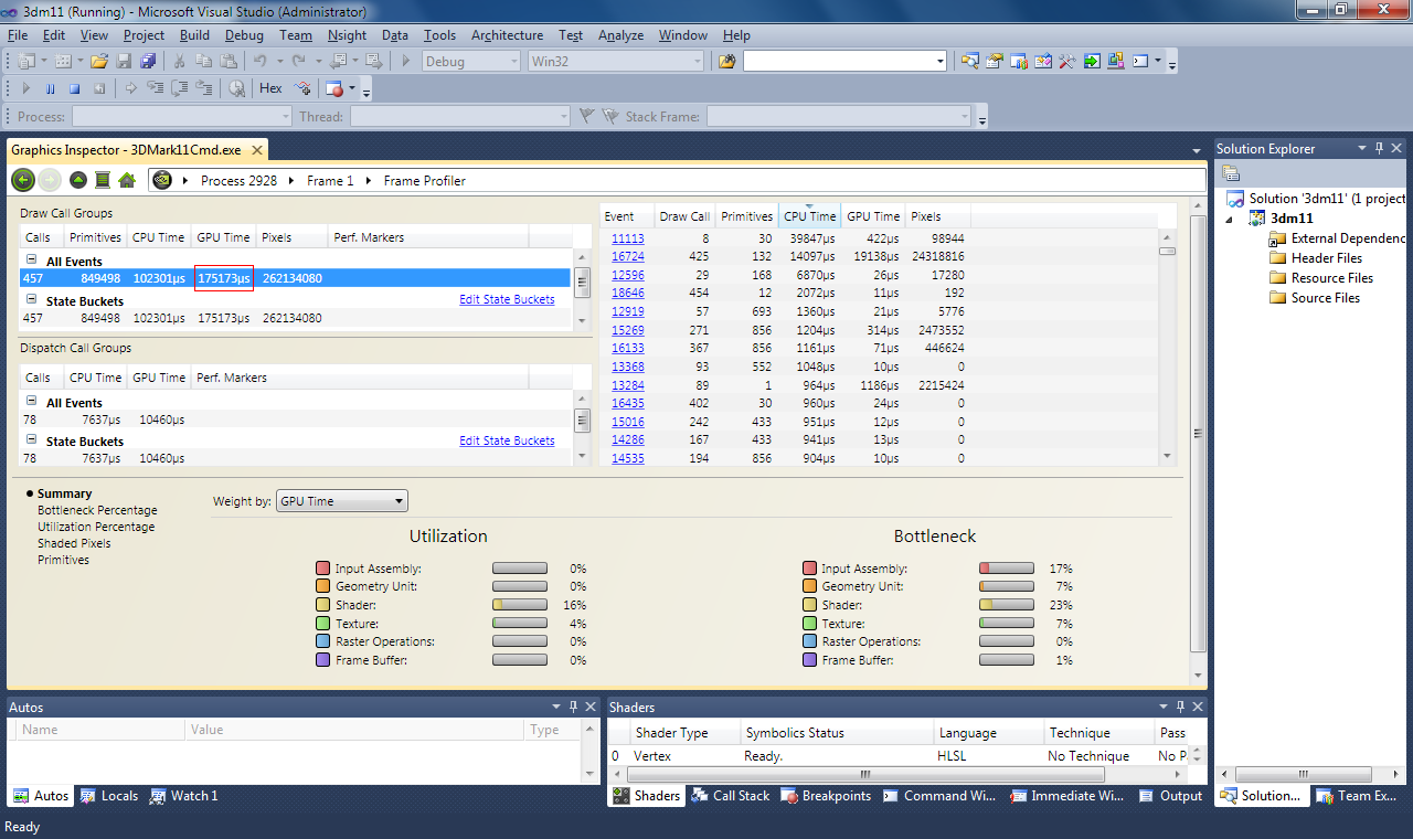 Для тщательного исследования 3DMark 11 мы использовали пакет Nvidia Parallel Nsight, предназначенный для 3D и CUDA разработчиков и поддерживающий D3D10 и D3D11 приложения. Публичные версии пакета, начиная с 1.51, позволяют исследовать в том числе и 3DMark 11, чем мы и не преминули воспользоваться.
