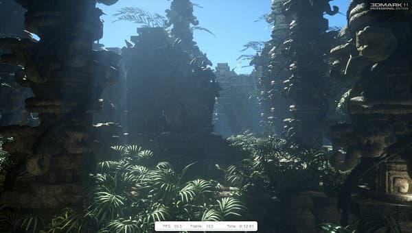 Третий графический тест основан на сцене «High Temple», в которой используется несколько источников света. Для одного из них рассчитываются тени, он же является ещё и объёмным. Уровень тесселяции на колоннах, статуях и растительности также средний. Постфильтрация используется и в этом случае.