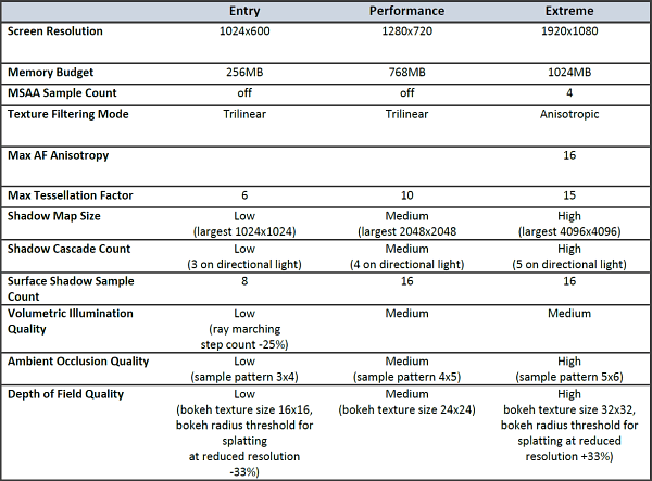 В профиле «Entry» (E) система тестируется в разрешении 1024×600 и графические настройки выбраны так, чтобы хватало 256 мегабайт видеопамяти. Соответственно, снижены и уровни тесселяции, размеры текстур и буферов, снижено качество фильтрации теней и отключены анизотропная фильтрация с полноэкранным сглаживанием. Этот набор предназначен для тестирования систем очень низкого уровня, вроде ноутбуков и даже нетбуков или настольных систем с интегрированной графикой.