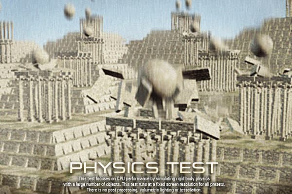 Тест физики на CPU использует простейшую сцену для имитации физики большого количества твёрдых тел. За взаимодействия объектов отвечает физический движок с открытым исходным кодом Bullet. CPU код распараллелен на несколько потоков, а нагрузка на GPU в этот раз намеренно минимальная — нет постобработки и других эффектов, и тест запускается всегда в сравнительно низком фиксированном разрешении.