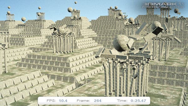 3DMark 11 — это уже восьмой бенчмарк серии. Последняя версия всемирно известного пакета 3D тестов включает шесть тестов: четыре графических, один физический и комбинированный. Тестовые сцены в 3DMark 11 написаны специально для нового бенчмарка, в них используются техники тесселяции, объёмного освещения, продвинутой постобработки. Тест физики имитирует поведение множества твёрдых объектов и выполняется на CPU, а комбинированный включает вычислительную нагрузку и на CPU и на GPU. В качестве физического движка пакет 3DMark 11 использует движок Bullet.