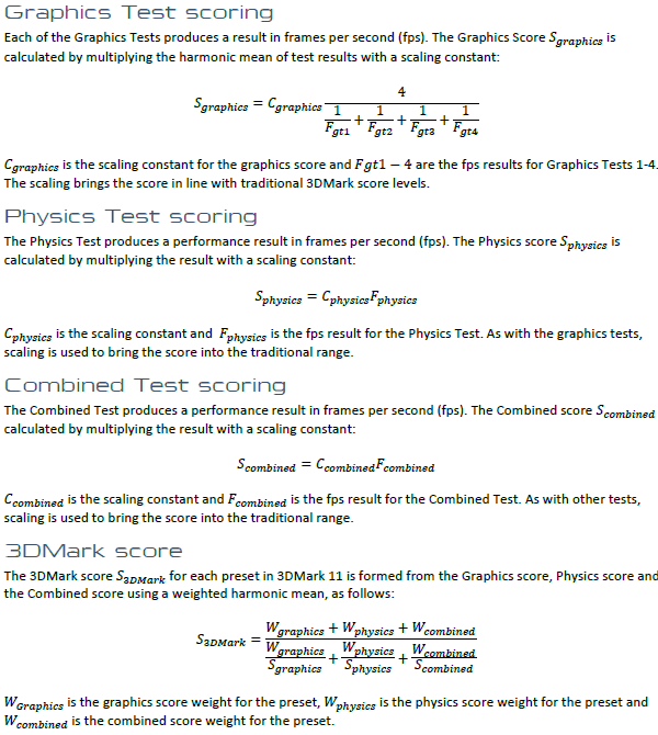 Итоговый счёт 3DMark 11 складывается из результатов всех тестов по специальным формулам. Мы не будем расписывать его подробно, а просто приведём соответствующие страницы из документации Futuremark, по которым при желании можно во всём разобраться: