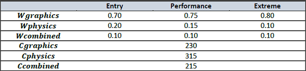 Профиль «Performance» (P) в предыдущем пакете (3DMark Vantage) использовал распространённое ранее разрешение 1280×1024. Но теперь стало намного больше мониторов с соотношением сторон 16:9, поэтому было принято решение сменить разрешение по умолчанию на 1280×720. Данный профиль является основным, так как это — единственный пресет, доступный в бесплатной версии пакета.
