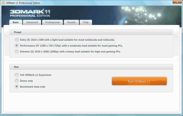 Основной претензией к базовой (Basic) версии предыдущего пакета 3DMark Vantage было то, что она слишком простая и даёт мало возможностей. В соответствующей версии 3DMark 11 компания Futuremark решила дать «халявщикам» чуть большее и позволила заливать на сайт один результат, совершать бесконечное количество запусков теста и даже дала доступ к режиму деморолика, пусть и в единственно возможном разрешении 1280×720.