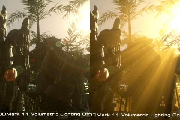Объёмное освещение — это техника, позволяющая имитировать распространение света в атмосфере, которая содержит частицы воды, пыли и т.п. Оно уже давно появилось в играх, хотя и в значительно более простом варианте. В 3DMark 11 объёмное освещение применяется в первых четырёх тестах, и оно наиболее хорошо заметно в сцене «Deep Sea» в непрозрачной воде, освещённой фонарями батискафов, а в сцене «High Temple» — в видимых лучах солнца, просвечивающих через заросли. Результат получается весьма эффектный, но крайне ресурсоёмкий.